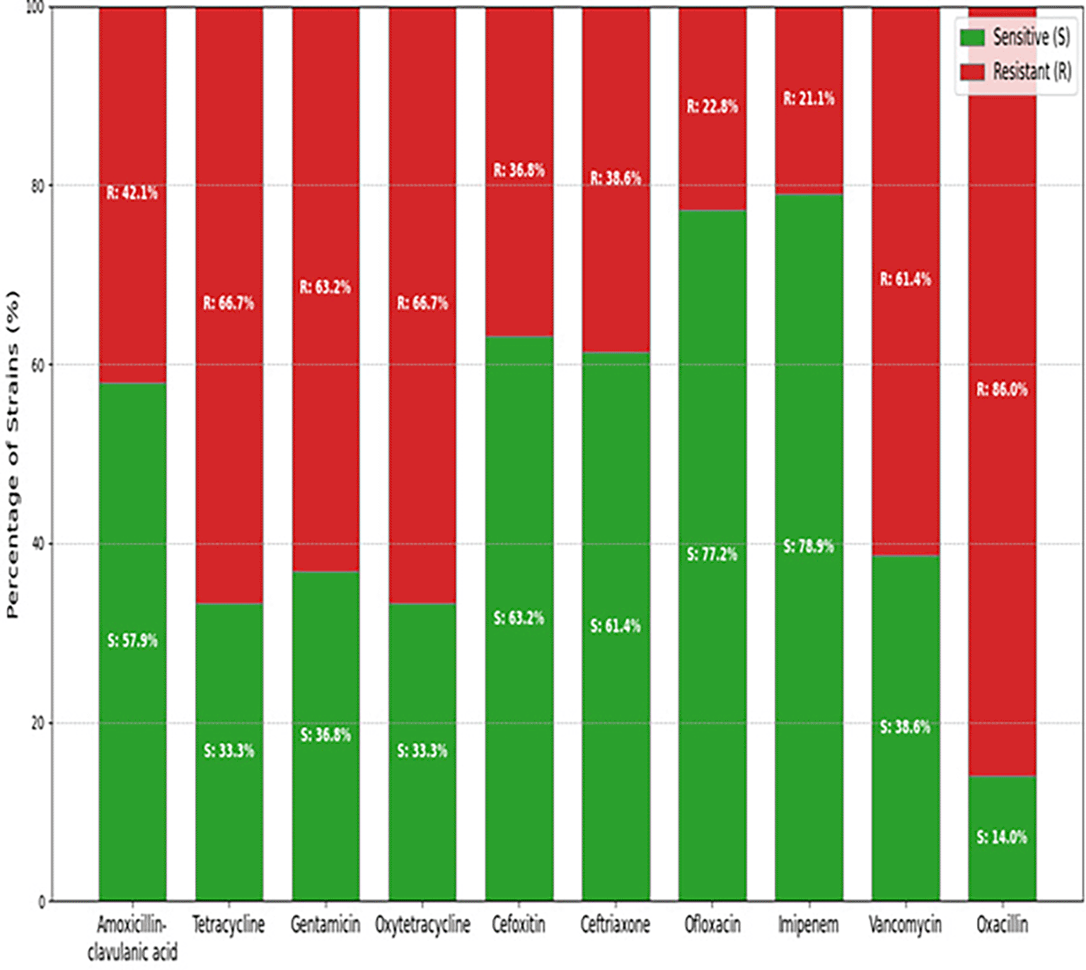 Figure 2 depicts the antibiotic resistance profiles of 156 Listeria strains across seven different antibiotics. The stacked bar chart shows the percentage of strains classified as sensitive (S) and resistant (R) for each antibiotic. Notably, Vancomycin and Oxacillin exhibit high percentages of resistant strains (83.1% and 88.1% respectively), while Ofloxacin has the highest percentage of sensitive strains (81.4%). This figure offers a clear visual summary of the resistance patterns observed in the tested Listeria isolates. While Figure presents the antibiotic profile, other subsequent figures present the pattern and relationships with other factors