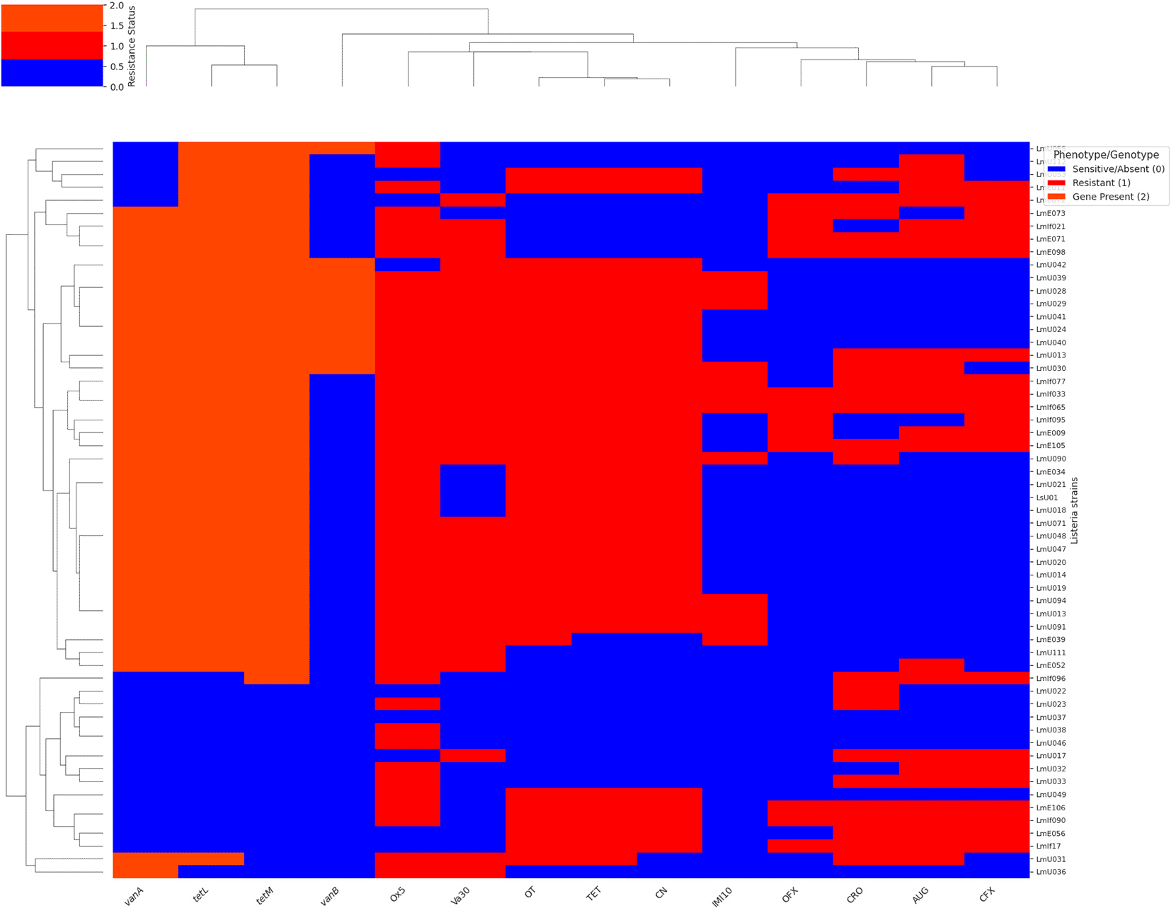 Figure 4 presents a hierarchical clustering heatmap illustrating the antibiotic resistance profiles and the presence of specific antibiotic resistance genes in a collection of Listeria strains. The heatmap is coloured to indicate sensitive/absent (blue, 0), resistant (red, 1), and gene presence (reddish-orange, 2) for each strain and antibiotic/gene. Hierarchical clustering was applied to both the Listeria strains (rows) and the antibiotic/gene markers (columns) to group those with similar patterns of resistance and gene presence, as depicted by the dendrograms on the left and top of the heatmap, respectively. The x-axis labels include the names of antibiotics and italicised names of resistance genes, while the y-axis labels represent the individual Listeria strains. This visualisation allows for the identification of clusters of strains with similar resistance phenotypes and genotypes, providing insights into the relationships between antibiotic resistance and the presence of these specific genes within the Listeria collection.