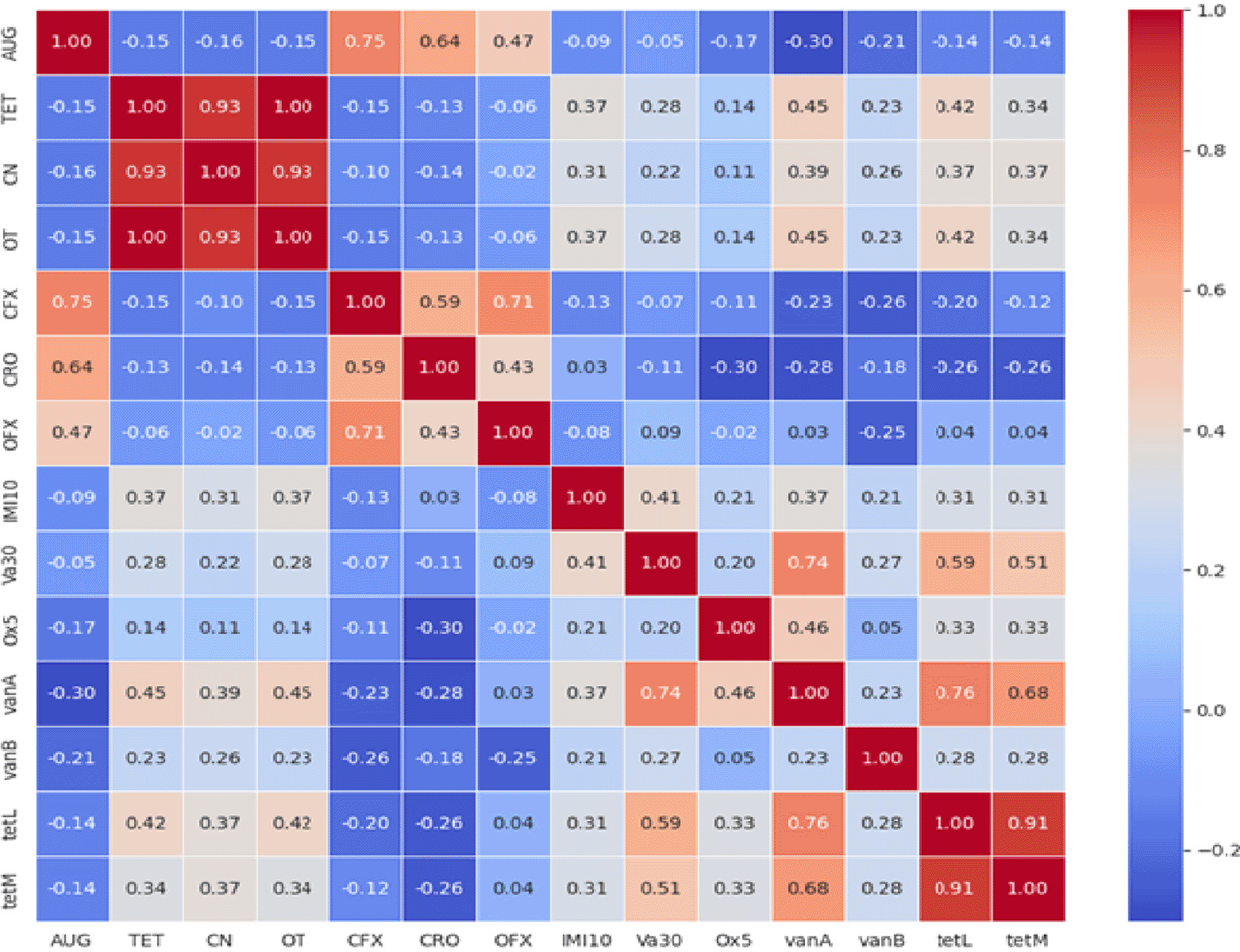 Figure 5 presents a heatmap visualising the pairwise correlations between the antibiotic resistance profiles and the presence of specific resistance genes. The heatmap utilises a colour scale to represent the strength and direction of the correlation coefficients, ranging from strong negative correlations (cool colours) to strong positive correlations (warm colours). Each cell in the heatmap displays the calculated Pearson correlation coefficient between the corresponding antibiotic/gene pairs. For example, AUG (augmentin) shows a positive correlation with CRO (ceftriaxone) with a coefficient of 0.64, suggesting that resistance to AUG is often associated with resistance to CRO in this dataset. Conversely, AUG exhibits negative correlations with the antibiotic resistance genes vanA (-0.30), vanB (-0.21), tetL (-0.14), and tetM (-0.14), indicating that resistance to AUG is generally less likely when these specific genes are present. This visualisation provides a clear overview of the interdependencies among the measured resistance phenotypes and genotypes, enabling the identification of highly correlated variables that may suggest potential associations between specific resistance mechanisms and observed resistance patterns.