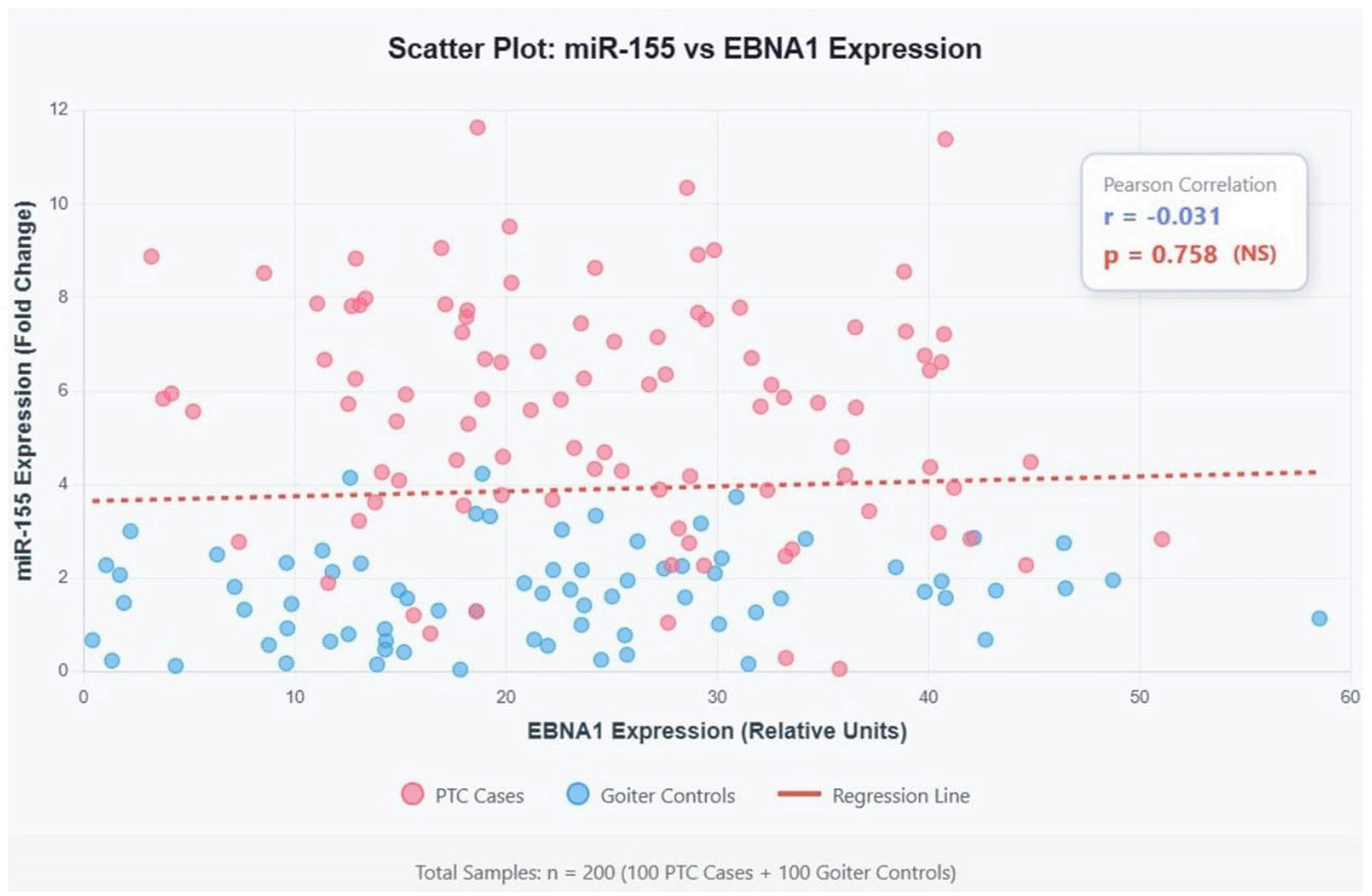 Correlation analysis was performed to examine the relationship between miR-155 and EBNA1 expression levels across all participants ( Figure 1). Surprisingly, despite the observed differences in expression patterns, Pearson correlation analysis revealed a weak negative correlation between miR-155 and EBNA1 expression (r = -0.031, p = 0.758). This finding suggests that while both markers are upregulated in PTC, their expression may be regulated through independent or complex interconnected pathways rather than a direct linear relationship.
