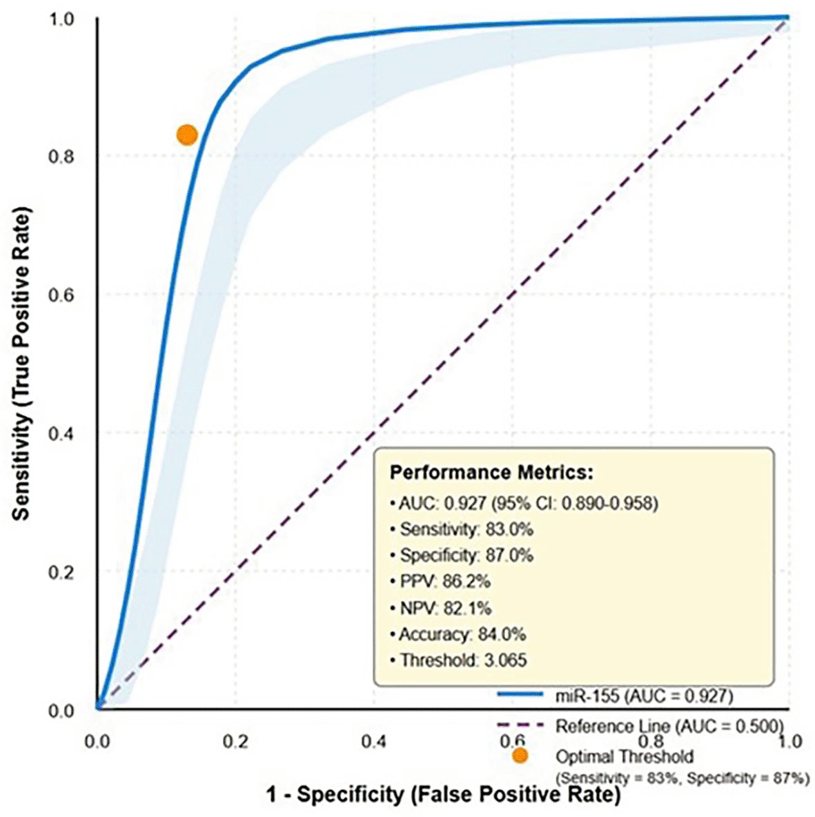 Receiver operating characteristic (ROC) curve analysis was conducted to evaluate the diagnostic utility of miR-155 for distinguishing PTC from benign nodular goiter ( Table 4). MiR-155 demonstrated excellent diagnostic performance with an area under the curve (AUC) of 0.927 (95% CI: 0.890-0.958). At the optimal cutoff value of 3.065, miR-155 achieved a sensitivity of 83%, specificity of 87%, positive predictive value of 86.2%, and negative predictive value of 82.1%, resulting in an overall diagnostic accuracy of 84% ( Figure 2).