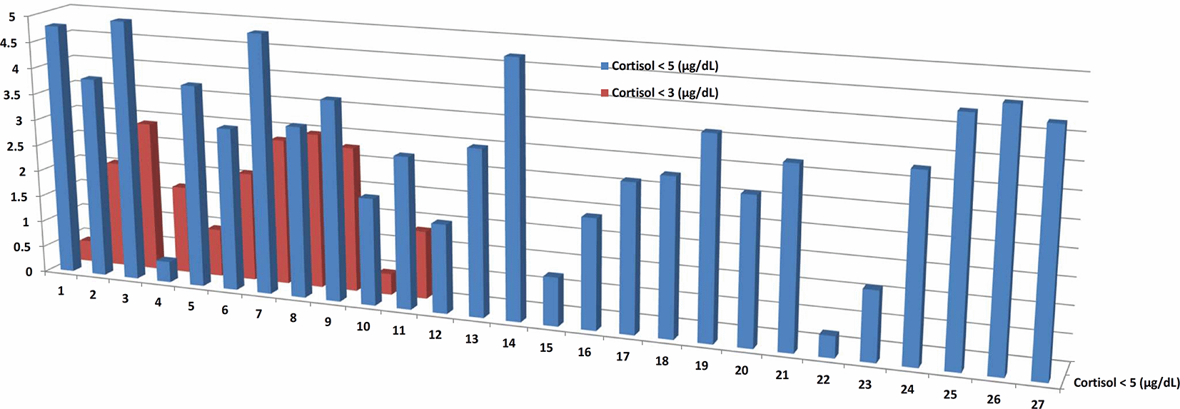 Below 3 μg/dL of cortisol levels in serum indicate inhibited adrenal function, while below 5 μg/dL concerned adrenal insufficiency typically.27