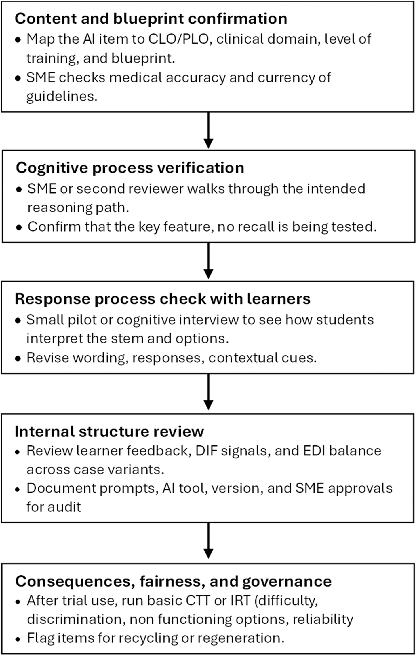 3. Pilot-test questions across mixed learner groups to identify differential performance that could signal construct-irrelevant bias (Rodman et al., 2024; Tolsgaard et al., 2023).