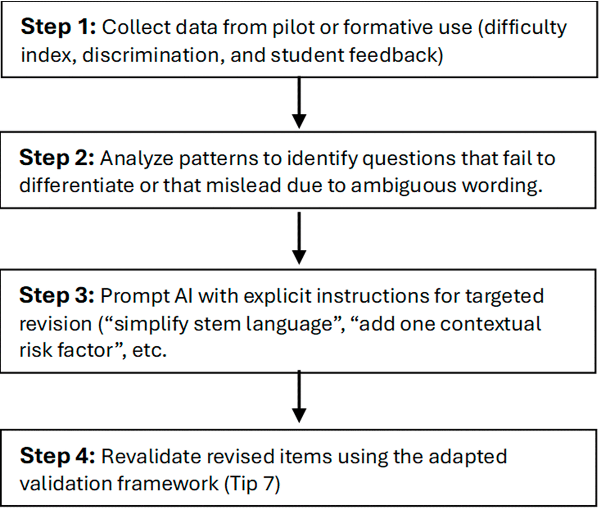 Note: This process focuses solely on psychometric and content improvement. Considerations of inclusivity and bias mitigation are addressed separately (see Tip 10).