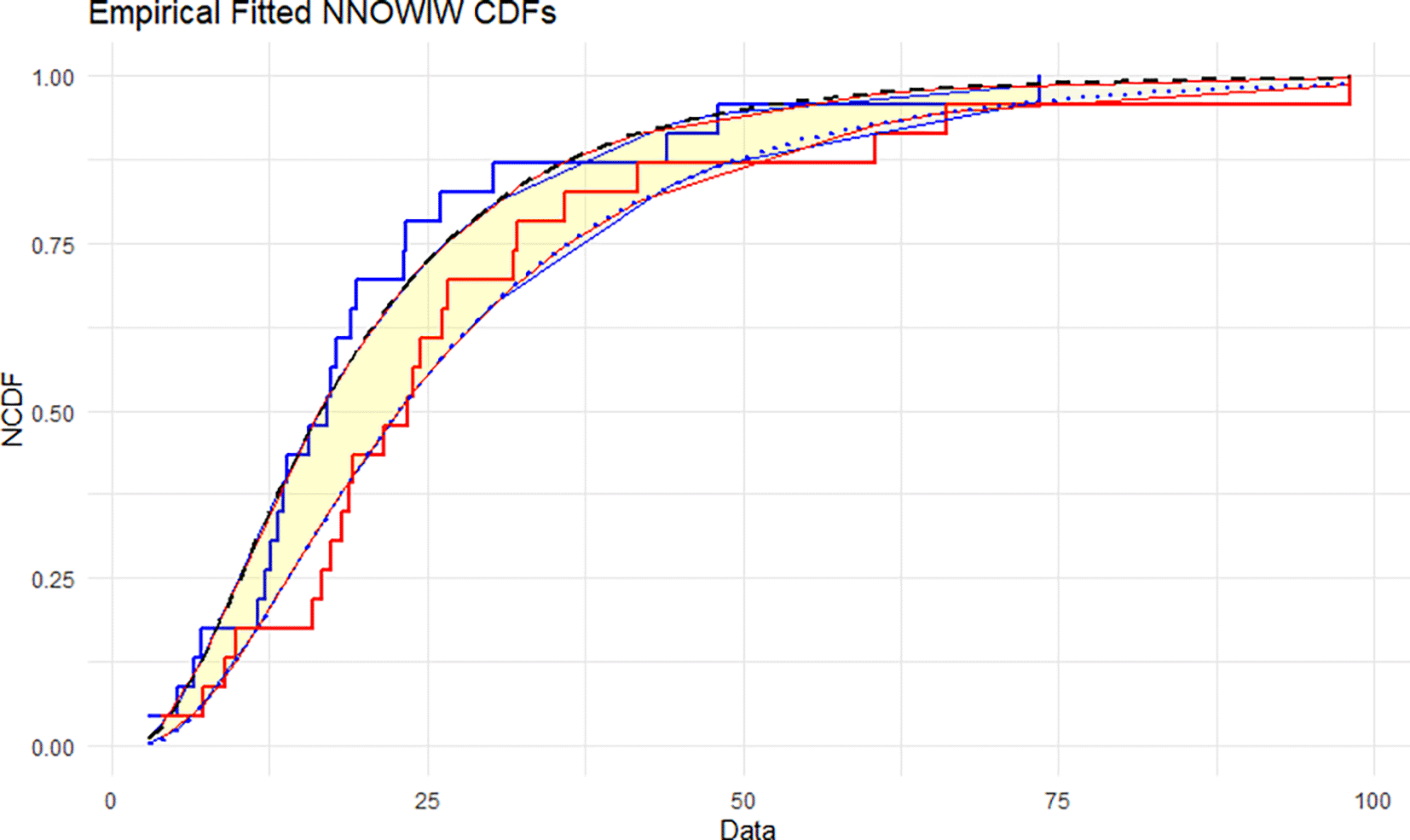 Table 7 shows the results of the statistical goodness-of-fit measures: the Cramer-von-Mises (W) statistic, the Anderson-Darling (A) statistic, and the Kolmogorov-Smirnov (K-S) statistic, in addition to the probability value (p-value) for each distribution.Comparing the values shows that the NNOWIW distribution has the smallest values for W, A, and K-S, with a high p-value (exceeding 0.7), indicating that it is the most suitable model for representing the data. In contrast, other distributions, such as NBeIW and NEGIW, showed higher values for these measures, indicating a poorer fit. The NLGamIW distribution, on the other hand, showed very high values, reflecting its poor fit to the data.