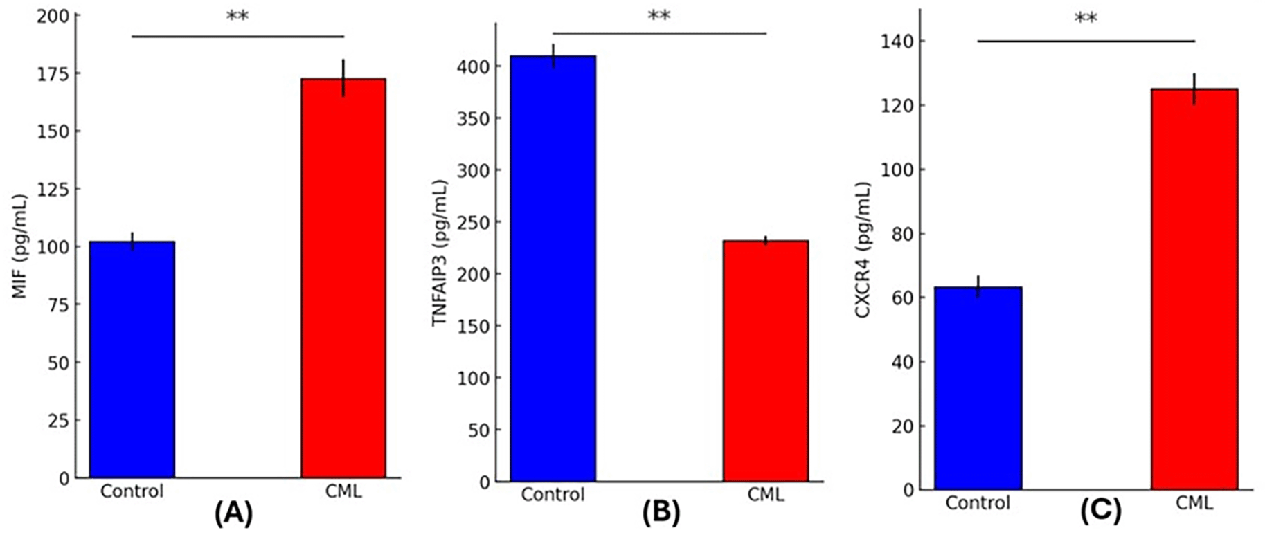 Comparing CML patients with healthy controls using quantitative analysis of circulating biomarkers showed striking differences. Signifying increased macrophage activation, MIF levels were significantly higher in the CML group (172.73 ± 8.22 pg/mL) in comparison to the controls (102.25 ± 3.88 pg/mL; p = 0.0000). The TNFAIP3 levels were considerably lower in CML patients (231.91 ± 4.85 pg/mL) compared to controls (409.89 ± 11.54 pg/mL; p = 0.0000), which may indicate that the anti-inflammatory regulation through the NF-κB pathway was suppressed. Patients had significantly increased CXCR4 expression (125.06 ± 5.05 pg/mL) compared to controls (63.30 ± 3.49 pg/mL; p = 0.0000) suggesting that there was an increase in chemokine receptor signaling and potential leukemic cell movement. The inflammatory and immunological dysregulation linked to CML pathogenesis is highlighted by these biomarker profiles, as shown in Figure 1.