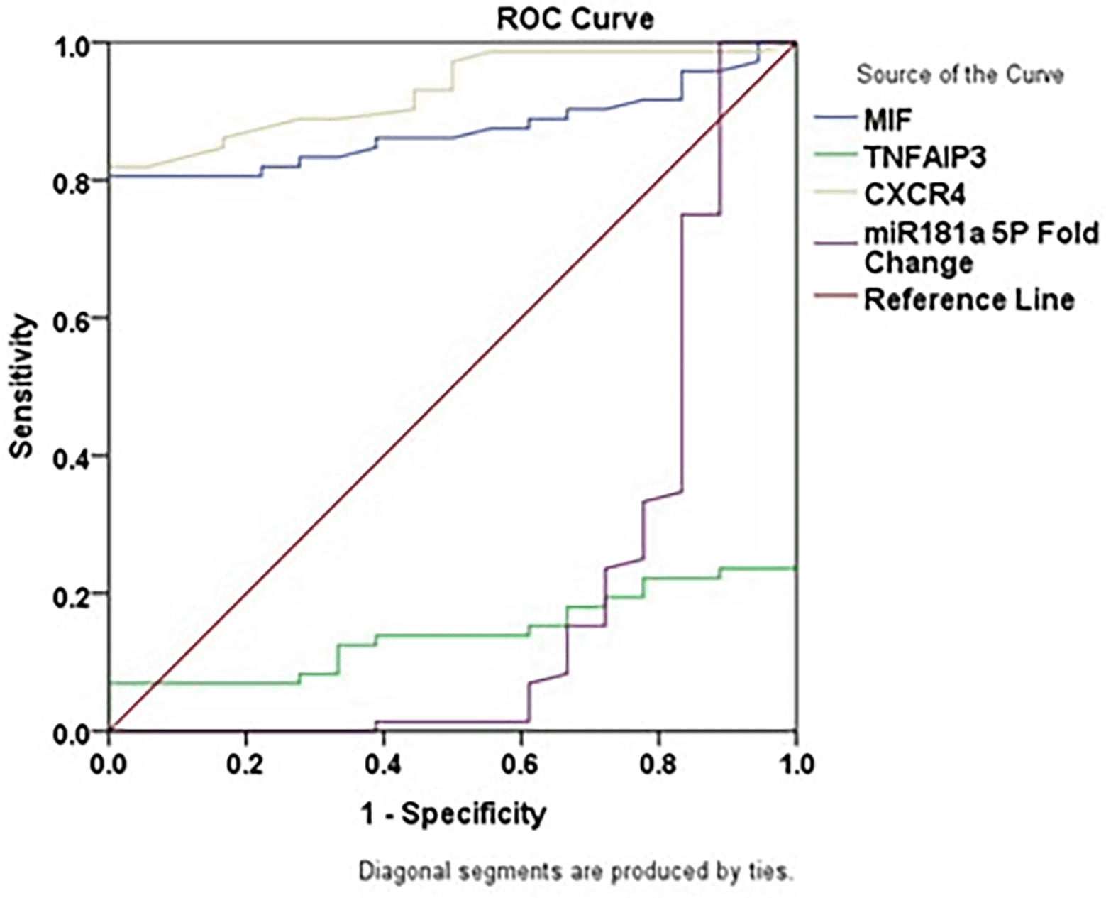 Compared to controls, CML patients exhibited reduced platelets, Hb and RBC while elevated WBCs recorded. There were significantly elevated serum levels of MIF and CXCR4, and reduced levels of TNFAIP3 (p<0.01) in CML patients compared to control. Moreover, higher miR-181a expression (2.28 fold, p=0.0001) recorded in CML compared to control. Positive correlations were observed between miR-181a expression and both MIF and CXCR4 levels while TNFAIP3 exhibited a reverse correlation. ROC analysis showed that MIF (AUC = 0.873) and CXCR4 (AUC = 0.929) exhibited strong diagnostic performance while TNFAIP3 (AUC = 0.142) and miR-181a-5p (AUC = 0.201) demonstrated weak accuracy consistent with their opposite expression patterns between CML patients and healthy controls.