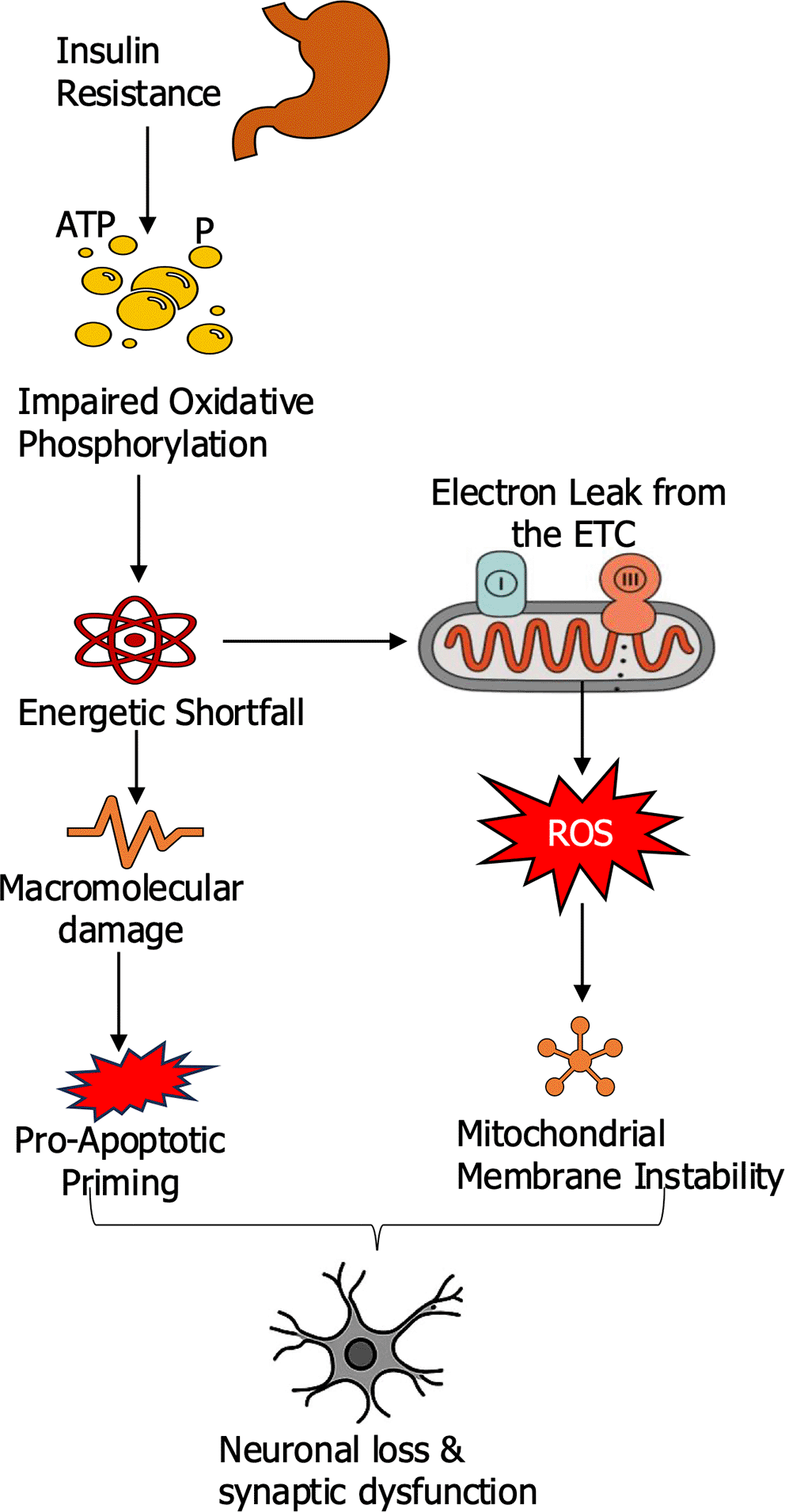 The figure illustrate how insulin resistance impairs oxidative phosphorylation (Complexes I and III), leading to reduced ATP production and electron leakage from the electron transport chain (ETC). The resulting reactive oxygen species (ROS) trigger macromolecular damage, including oxidation of mitochondrial DNA, proteins, and lipids. This initiates mitochondrial membrane instability, release of pro-apoptotic factors, activation of the caspase cascade, and neuronal apoptosis.