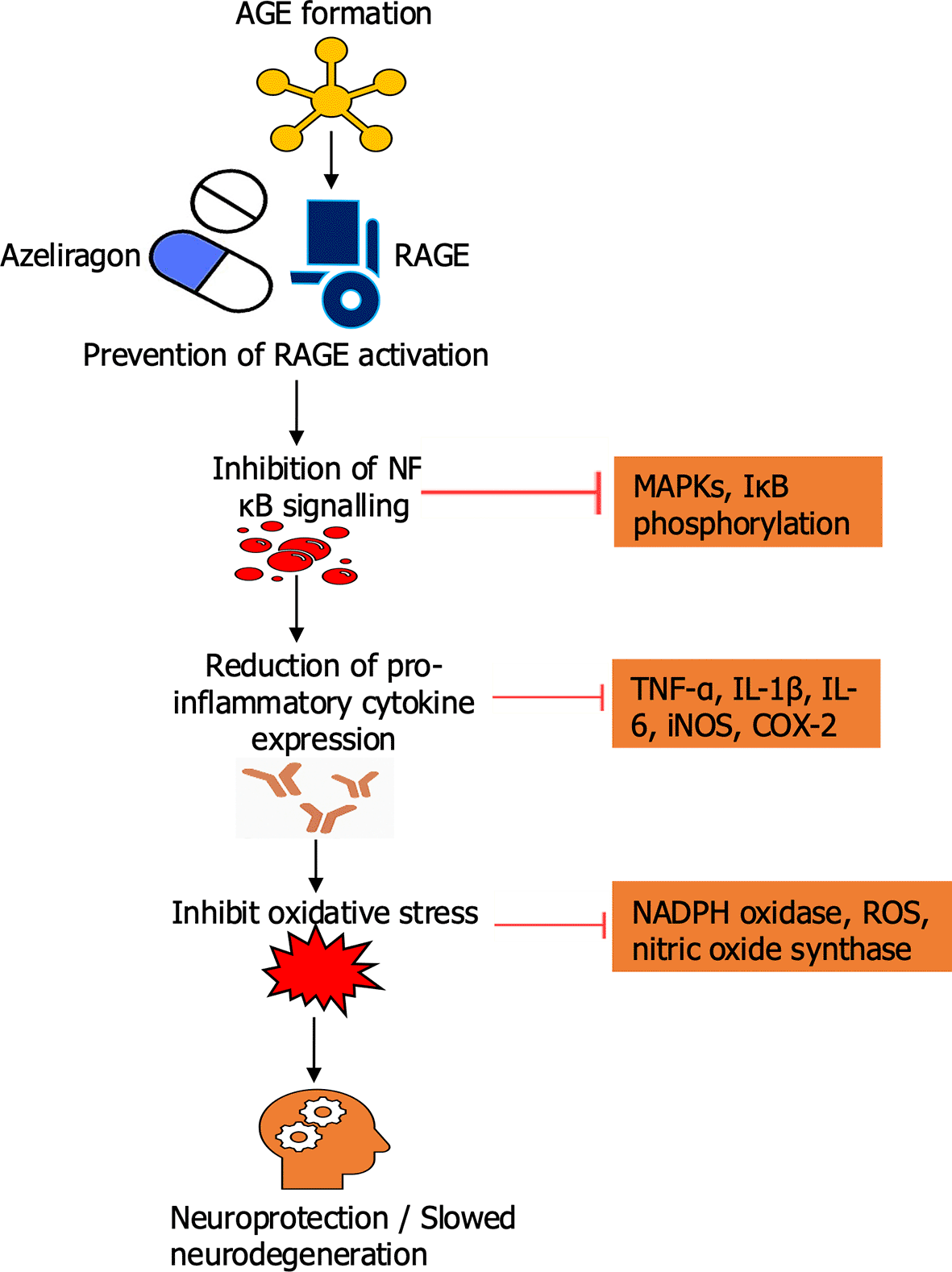 Schematic illustration showing the inhibitory effect of Azeliragon on the AGE–RAGE signaling pathway in Alzheimer’s disease. Under normal pathological conditions, binding of advanced glycation end-products (AGEs) to their receptor (RAGE) activates downstream NF-κB signaling, leading to cytokine release, oxidative stress, and subsequent amyloid-beta (Aβ) accumulation and neurodegeneration. Azeliragon blocks AGE binding to RAGE, preventing pathway activation and reducing neuroinflammation, oxidative damage, and Aβ-mediated neuronal injury.