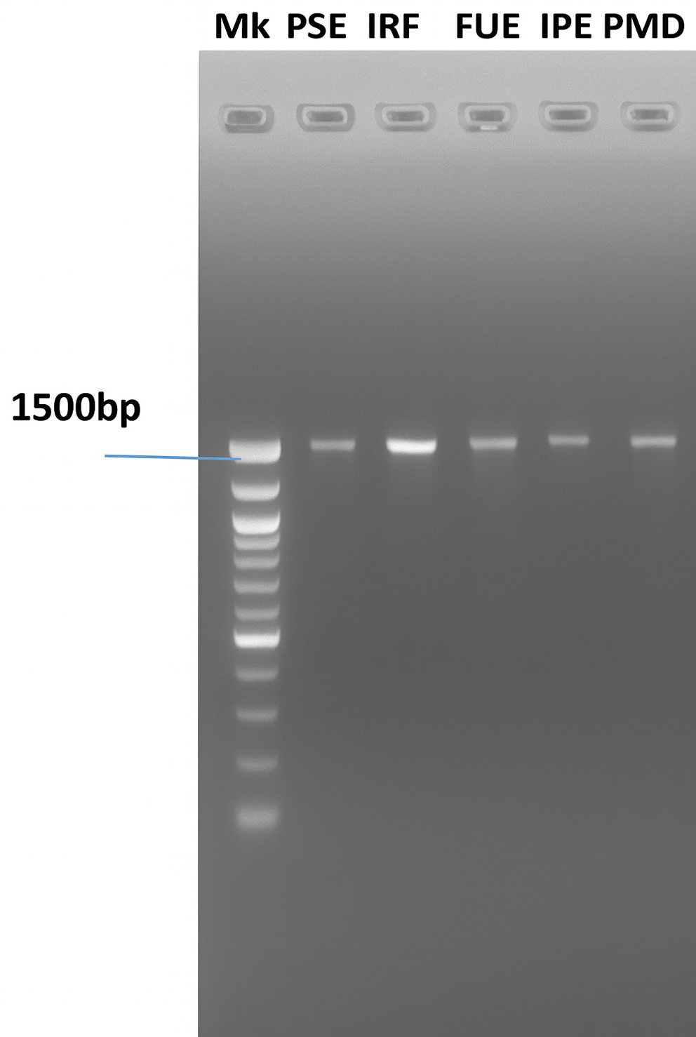 Determination of the integrity of the amplified gene was determined by placing the fragment on a 1% agarose gel that was run to confirm amplification. The buffer (1XTAE buffer) was prepared and it was then applied to the preparation of 1.5% agarose gel by boiling the suspension in a microwave oven for 5 min. The molten agarose was left to dry and cool to 60°C and then stained with 3 ml of 0.5 g/mL ethidium bromide, which is invisible ultraviolet (UV) radiation and emits visible orange radiation. The slots of the casting tray were loaded with a comb, molten agarose was poured into the casting tray, and the gel was left to harden for 20 min to establish the wells. The gel tank was filled gradually by pouring × 1XTAE buffer into the gel. Each of the PCR products (4 mm) was mixed with 2 mL of 10X blue gel loading dye and loaded into the wells when the 100 bp DNA ladder was loaded into well 1. The gel was subjected to electrophoresis for 45 min at 120 V, followed by UV transillumination, and photographs were taken. The PCR products were assessed by comparing the mobility of a 100 bp molecular weight ladder that was stained and placed into a gel with the experimental samples.
