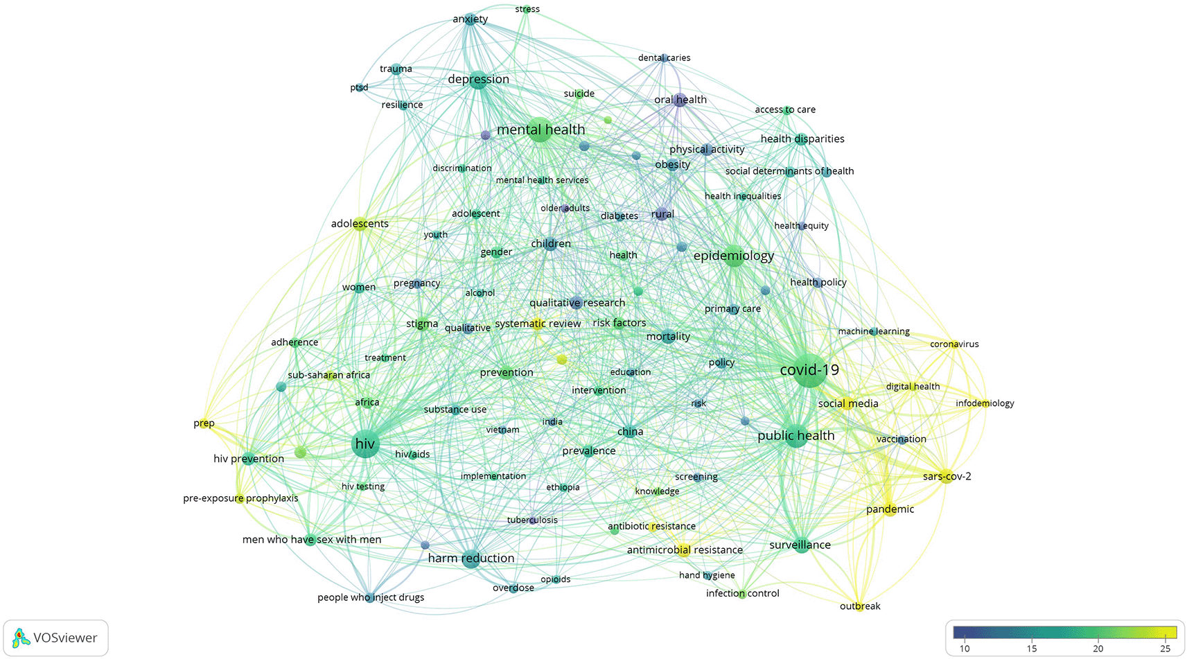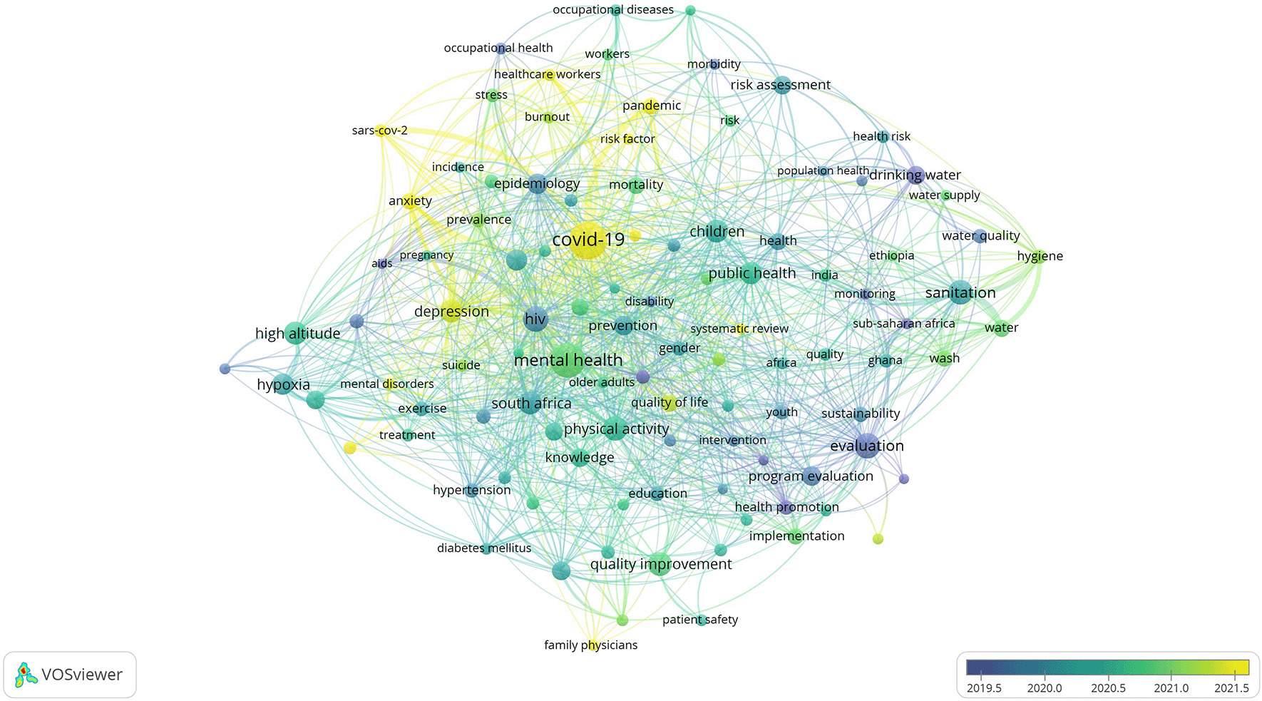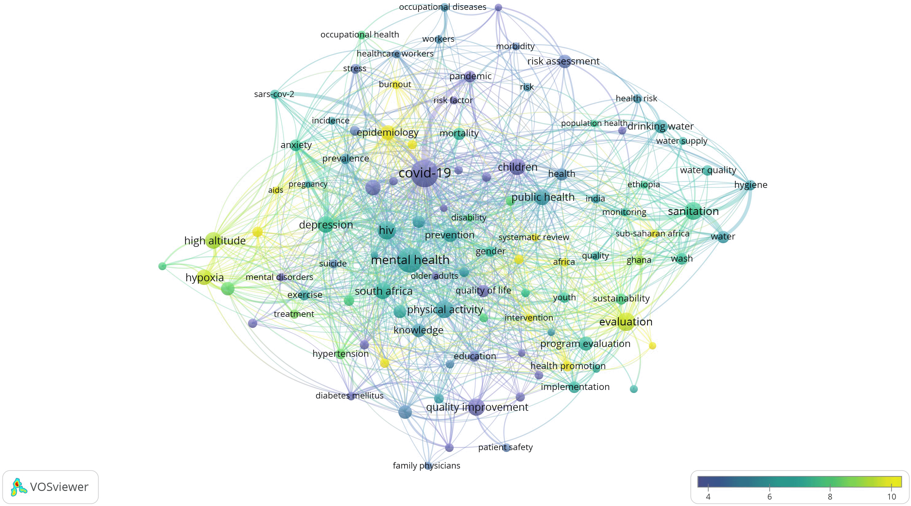 The findings of our study uphold the findings of prior studies: COVID-19 became a focal point in scientific research published from 2016 to 2025.19 Keywords such as “COVID-19,” “SARS-CoV-2,” and “mental health” consistently stood out, which is not surprising given the radical increase in pandemic-related studies during this time. This has also been noted in other bibliometric research works. The preeminence of COVID-19 publications in well-known scholarly works is confirmed by others’ findings,19,20 who made the same observations about pandemic-related issues in top-tier journals. The common recurrence of “mental health” in Q1 and Q2 journals is probably consistent with widespread concerns about the psychological effects of the pandemic, highlighted.21