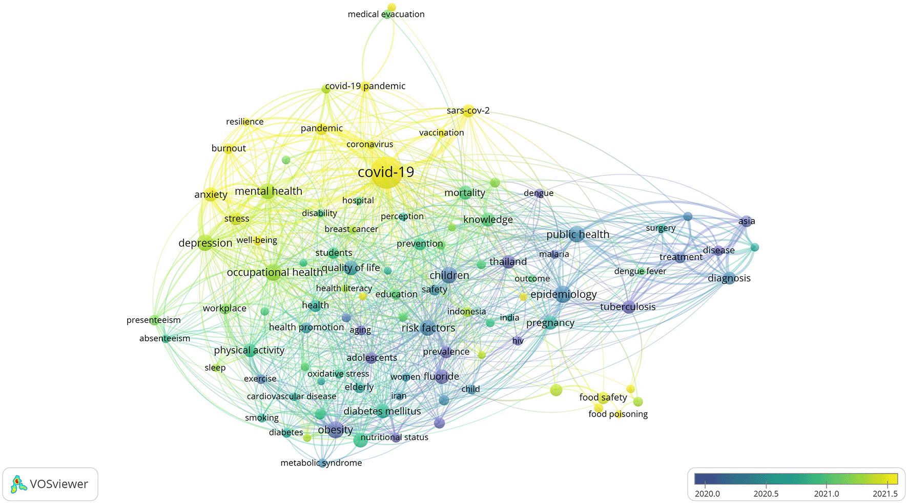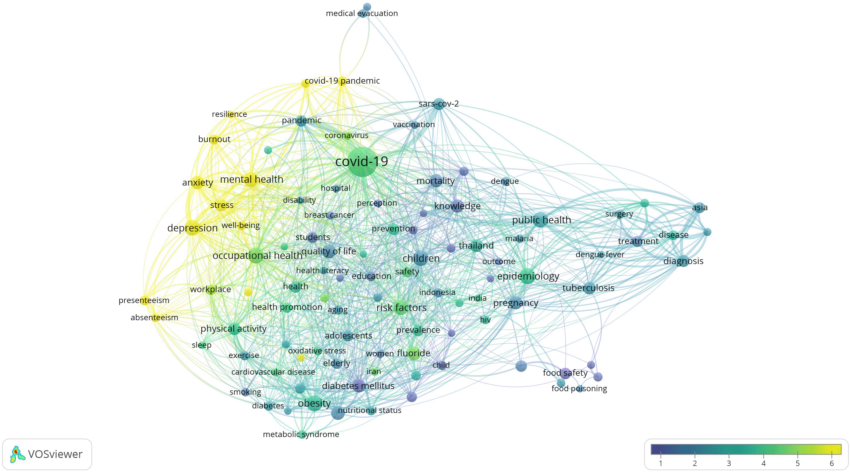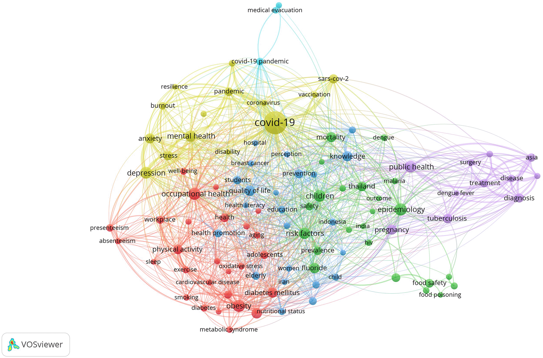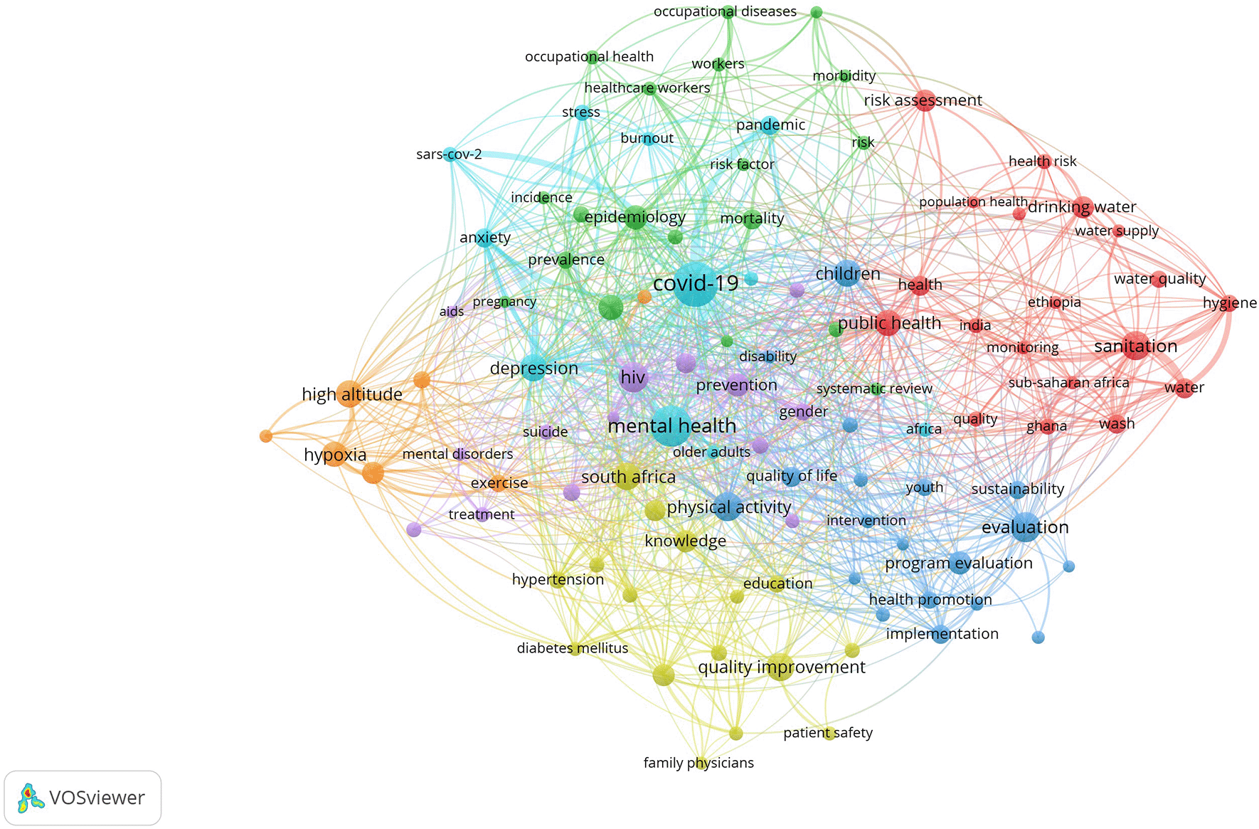 This bibliometric study was conducted to explore the bibliometric characteristics of PHEOH journals across different Scimago categories. Our analysis revealed that the most common author keyword in all quartile categories (Q1 to Q4) was “COVID-19”. Additionally, the keyword with the highest Total Link Strength (TLS) represented the central research focus within each category. Notably, “COVID-19” was also identified as the most current topic among the top 10 author keywords in the Q1, Q2, Q3, and Q4 categories. Based on indexed keywords, “humans” had the highest frequency of occurrence across all quartiles. Furthermore, among the top 10 author keywords in Q1 to Q4, terms such as “SARS-CoV-2,” “children,” “assessment,” and “mental health” received the highest citations.