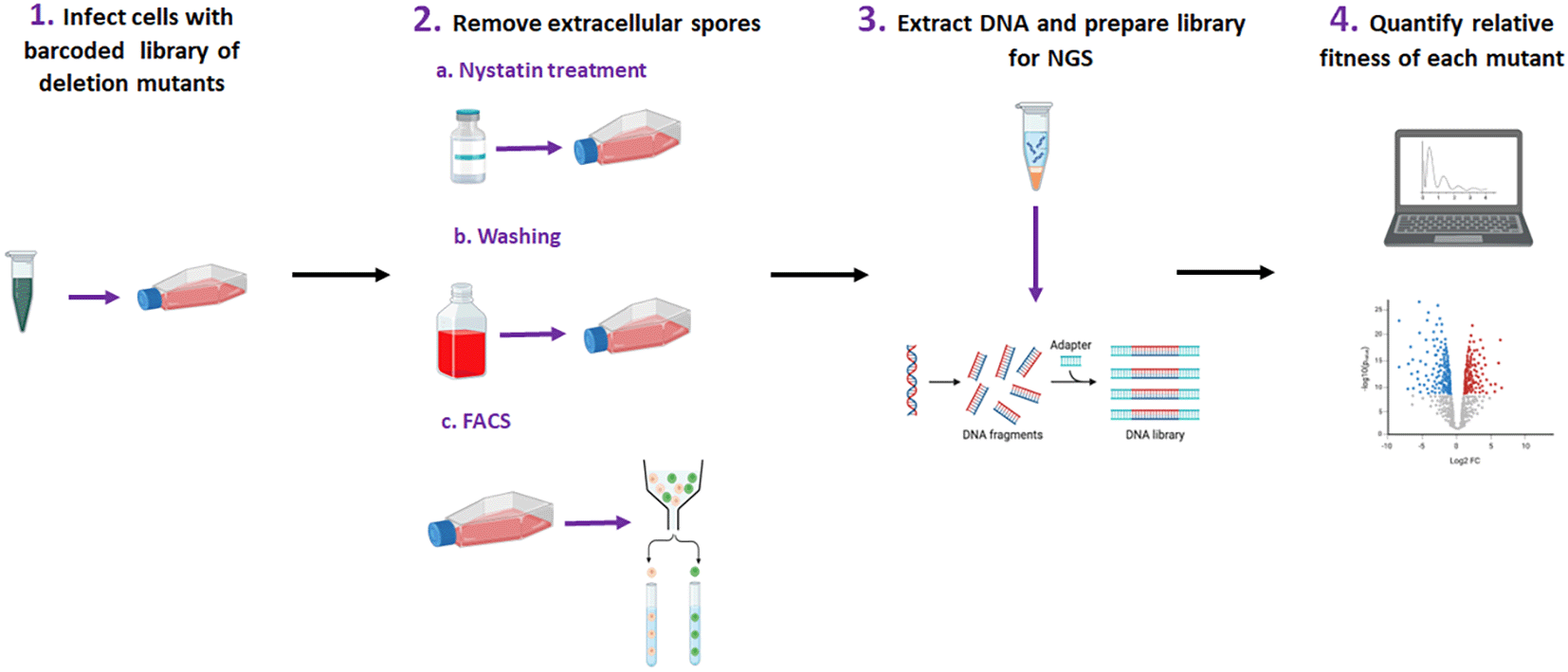 This protocol has been separated into four major sections, which are summarized in Figure 1. In section 1, we describe the culture and infection of A549 epithelial cell monolayers with a pool of barcoded A. fumigatus gene-knockout strains. In Section 2, we provide instructions for three different methods of removing extracellular A. fumigatus conidia, as well as comparative analysis, to allow the end-user to select the one that is most appropriate for them. These methods include pharmacological killing of A. fumigatus using nystatin,26 mechanical removal of extracellular conidia using cell surface washes23 and differential staining of intracellular and extracellular conidia coupled with fluorescence-activated cell sorting (FACS) of airway epithelial cells.21 Section 3 describes the extraction of genomic fungal DNA from A. fumigatus conidia within airway epithelial cells, and the preparation of a library for next-generation sequencing. Section 4 describes the bioinformatics pipeline used to analyze sequencing outputs, as well as the suggested validation experiments. Finally, we provide a dedicated section to validate the experiments to confirm the bar-seq observations.