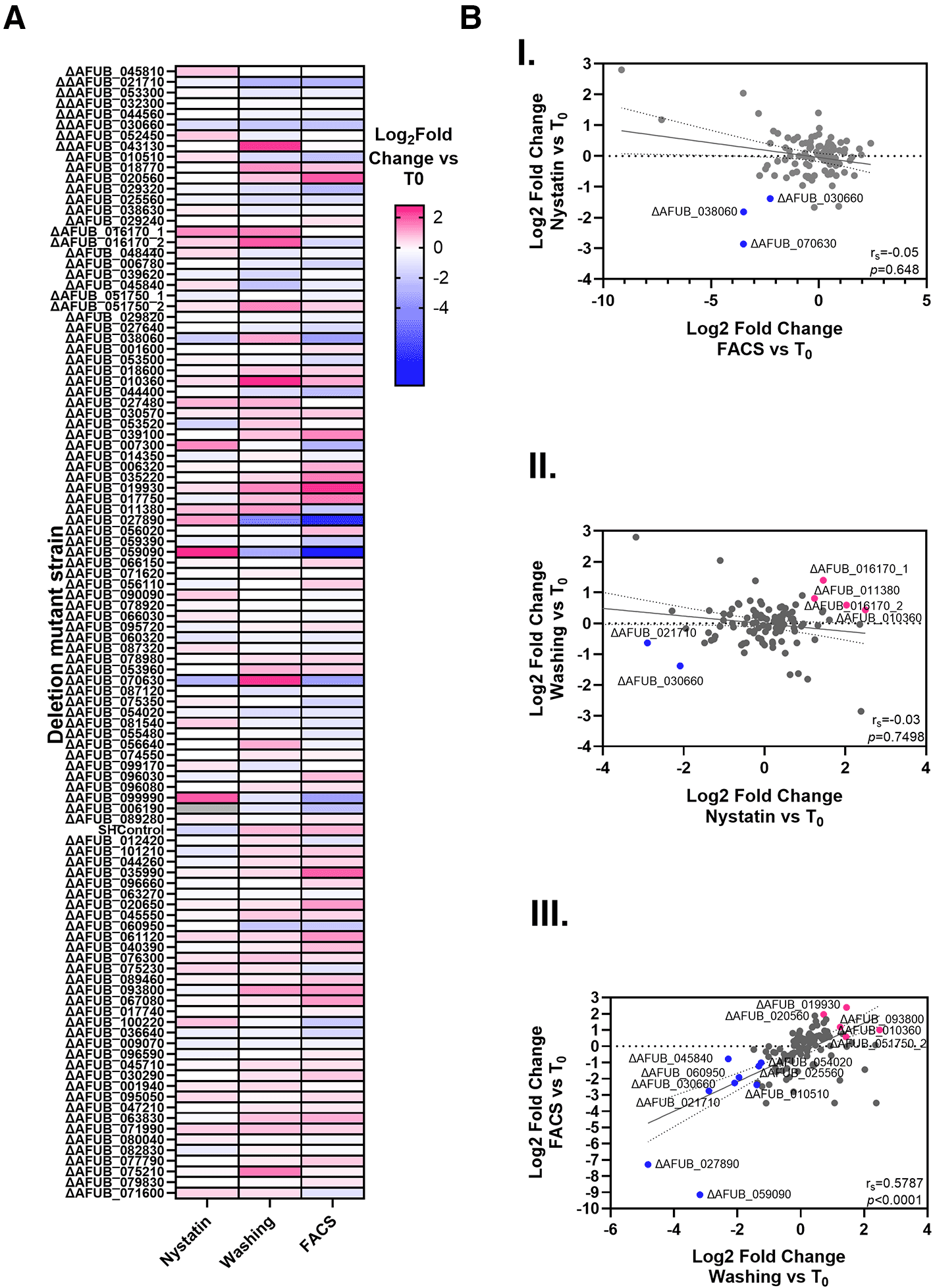 The expectation was that all three experiments, which were designed to assess the impact of gene knock-out on a combination of cellular uptake, spore killing, and host fitness, would generate similar outputs; however, this was not the case. Although a reasonable correlation was observed between FACS sorting and spore washing approaches (rs=0.5787), and this correlation was statistically significant (p < 0.0001), no correlation was observed between these approaches and nystatin treatment ( Figure 2). This may indicate, contrary to our expectation, that nystatin treatment is not effective at differentiating internalized from external spores.