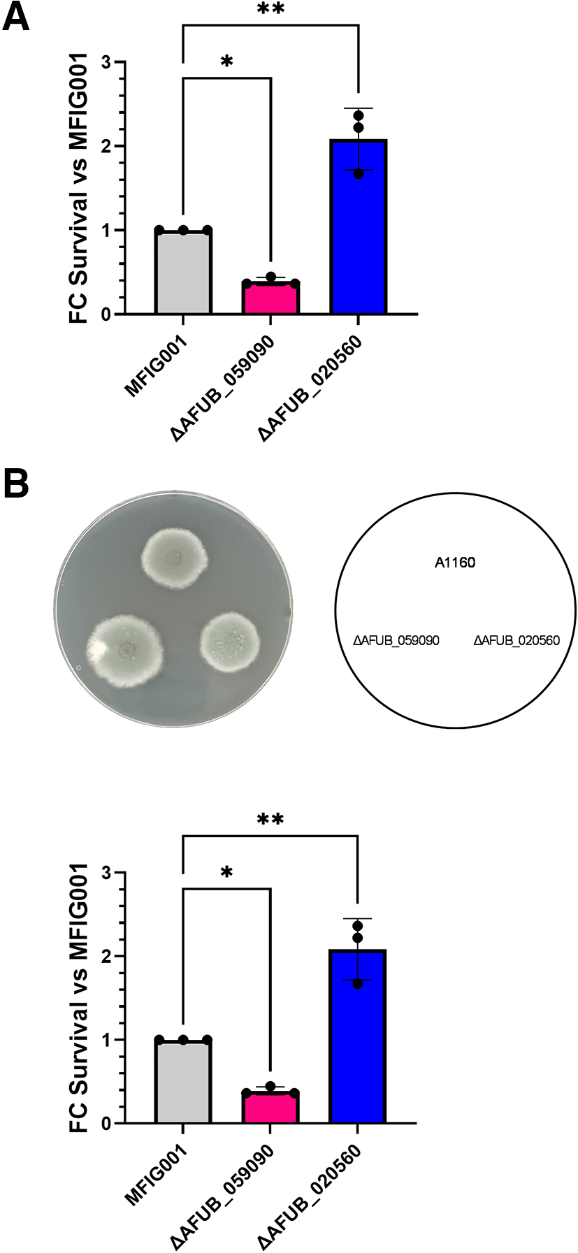(A) A. fumigatus survival of individual null mutant strains identified by bar-seq analyses during infection of A549 airway epithelial cells (n = 3). (B) Growth rate analyses of individual A. fumigatus null mutant strains. * p < 0.05, p < 0.01.