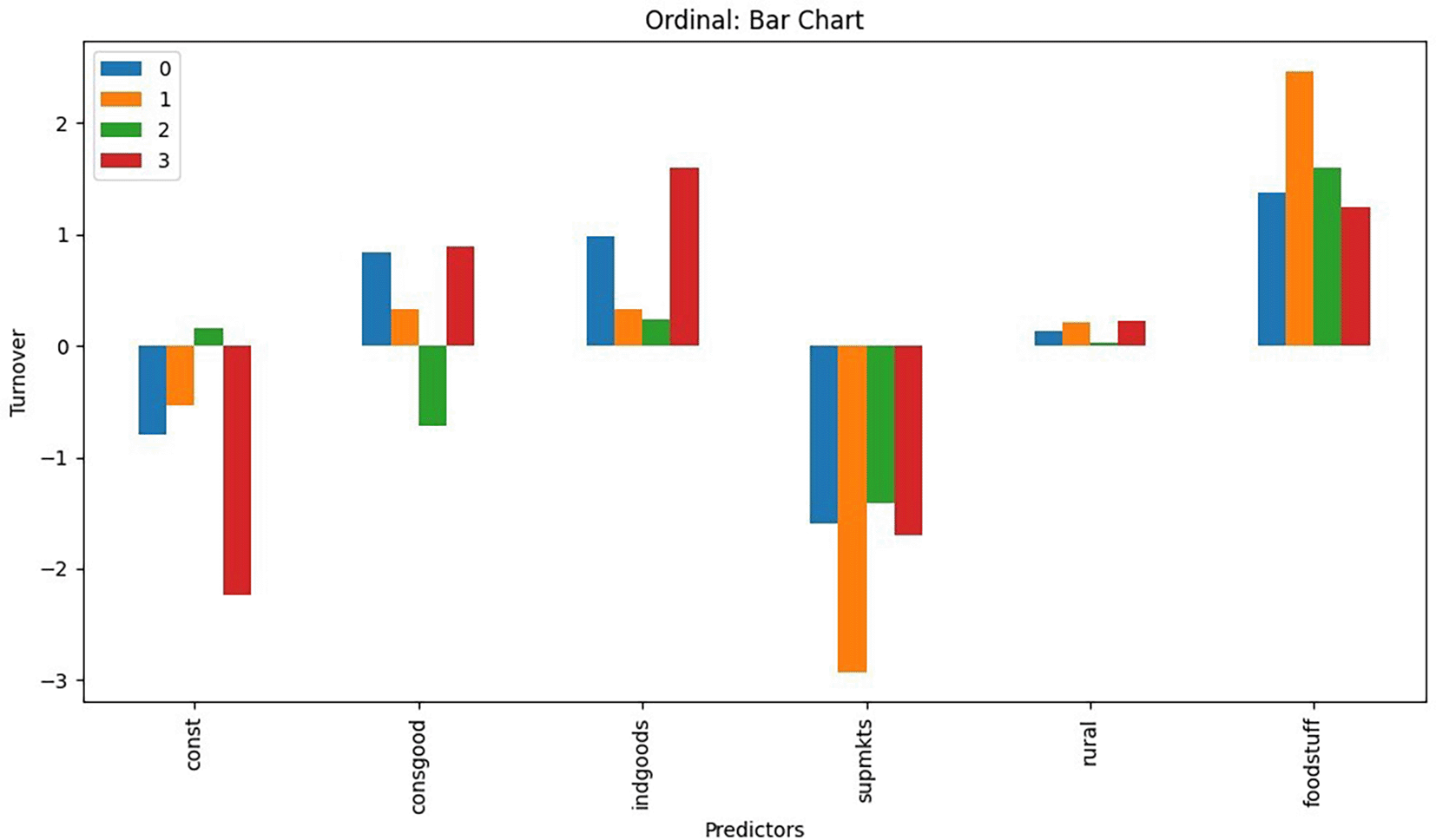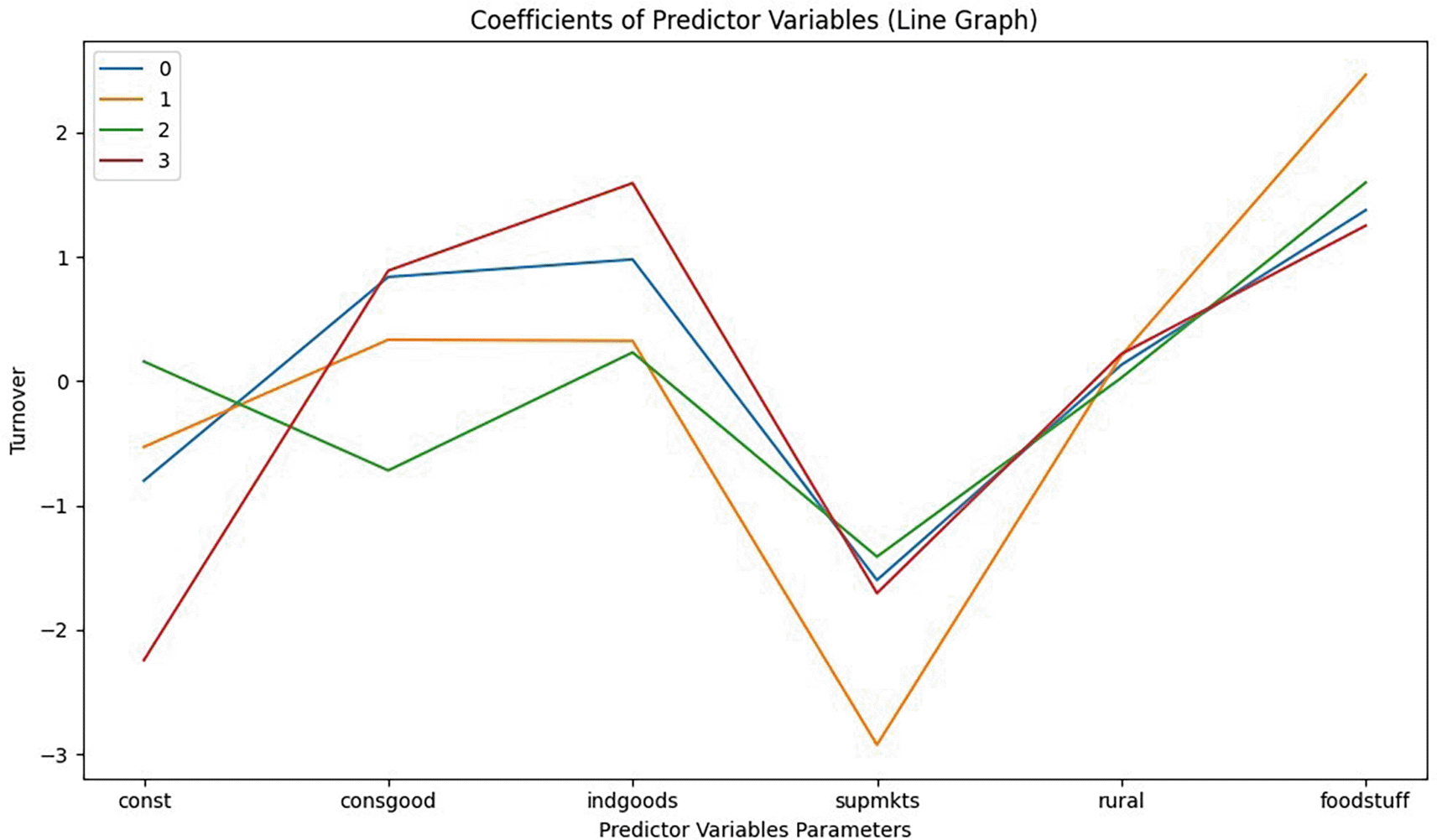 Each turnover category was compared to the baseline category Turnover of Above100 m. The variables consgood, indgoods, supmkts , urban , rural , and foodstuff play roles in determining the likelihood of being in each turnover category.