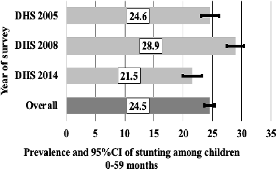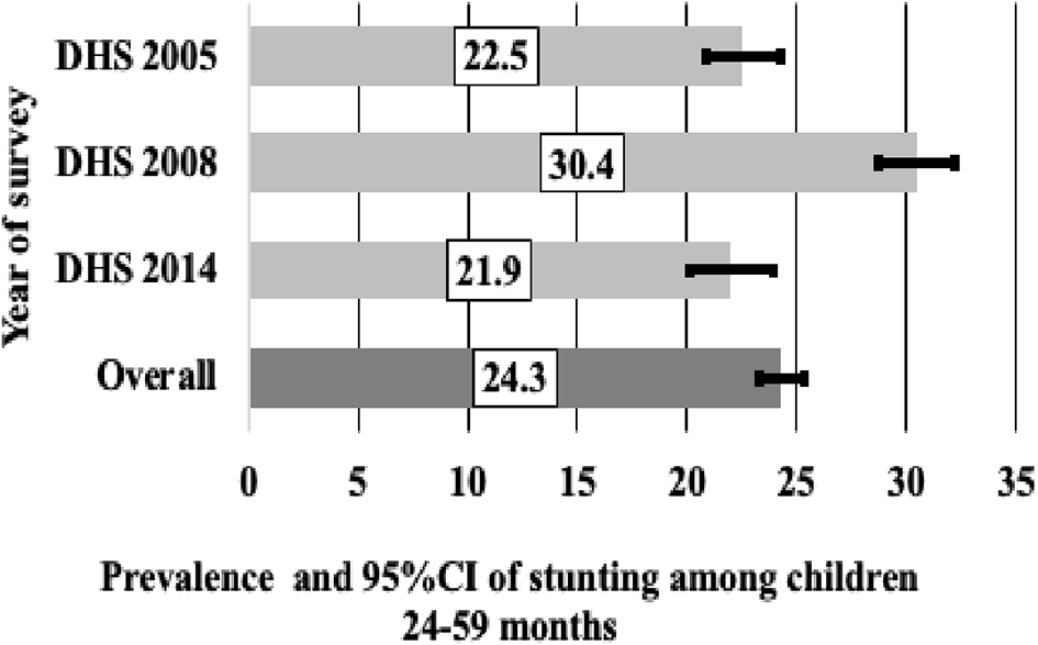Therefore, this study aimed to investigate stunting among children aged 0-23, 24-59 and 0-59 months in Egypt and explore associated factors by pooling the 2005, 2008, and 2014 EDHS. The study will contribute to the growing body of evidence that informs national government institutions, public health researchers, and policymakers working to address the underlying factors associated with child stunting in Egypt. It stands out from previous research on stunting among children in Egypt due to its unique focus on combining data sets from 2005 to 2014. The study utilises population-based national representative data and provides age-specific results by examining the prevalence of stunting in three age groups: 0-23 months, 24-59 months, and 0-59 months across the three-survey data.