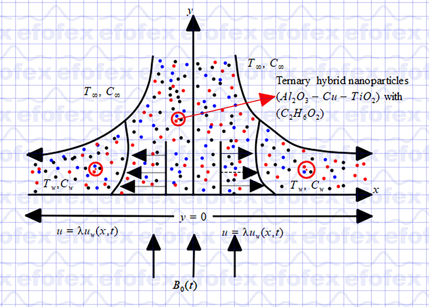 Nanofluids are advanced colloidal fluids that consist of a base fluid (such as water, oil, or ethylene glycol) combined with nanoparticles typically ranging in size from 1 to 100 nanometers. These nanoparticles can be made from various materials, including metals (like copper and silver), oxides (such as alumina and silica), and carbon-based materials (like graphene). Nanofluids represent a significant advancement in thermal management technology, offering enhanced heat transfer capabilities and efficiency across various applications. Ongoing research continues to explore their properties, optimize formulations, and expand their applicability in diverse fields. Hybrid nanofluids are advanced fluids that consist of two or more different types of nanoparticles suspended in a base fluid. This combination aims to optimize thermal and physical properties, enhancing heat transfer capabilities beyond what single-component nanofluids can achieve. The presence of multiple types of nanoparticles can lead to a significant increase in thermal conductivity, improving heat transfer efficiency. Hybrid nanofluids offer a promising approach to enhance heat transfer performance in various applications. By leveraging the unique properties of multiple nanoparticles, they provide improved thermal management solutions in diverse fields, from industrial processes to renewable energy systems. Ternary hybrid nanofluids are advanced fluids that incorporate three different types of nanoparticles to enhance thermal and transport properties. By combining multiple nanoparticles, these fluids can achieve superior heat transfer capabilities compared to conventional fluids or even binary hybrid nanofluids. The addition of different types of nanoparticles can optimize properties such as thermal conductivity, viscosity, and stability, making them suitable for a variety of applications, including cooling systems, heat exchangers, and energy storage. Alqawasmi et al.5 investigated the effects of Cattaneo-Christov heat exchange on the flow of ternary hybrid nanofluids over a spinning disc, excluding non-linear radiant heat. Their findings indicated that an increase in the magnitude of the suction and injection parameters leads to a reduction in the velocity distribution profile. Mahboobtosi et al.6 studied the impact of utilizing a ternary hybrid nanofluid in place of a single nanofluid. They concluded that improvements in the curvature parameter, volume fraction, and shape factor resulted in enhanced velocity and temperature profiles. Farooq7 examined the mixed convection of stagnation point flow of ternary hybrid nanofluids toward a vertical Riga plate. He concluded that when the mixed convection parameter is introduced to counteract the flow, the temperature profile decreases while the velocity profile increases. Abbas et al.8 examined the mixed convection of ternary hybrid nanofluids during cilia transport through a curved channel. Their findings indicated that increasing the cilia length parameter enhances the liquid velocity. Nabwey et al.9 investigated the magnetohydrodynamics (MHD) of two-dimensional incompressible boundary layer flow of non-Newtonian Carreau ternary hybrid nanofluids with heat transfer over an exponentially stretched curved surface. They demonstrated that the heat transfer rate and skin friction increase as one moves from the base fluid to mono, hybrid, and then ternary nanofluids. Jamshed et al.10 explored in order to find an efficient heat-transmitting fluid to replace standard fluids and revolutionary nanofluids. Noreen11 utilized heat radiation to study the magnetohydrodynamic (MHD) flow of ternary hybrid nanofluids between double disks. The results indicated that increasing variations in the thermal relaxation parameter lead to a decline in the thermal distribution profile. Al Garalleh12 investigated heat diffusion and mass transport in the flow of ternary hybrid nanofluids (TiO2 − Al2O3 − SiO2) over a stretching/shrinking wedge geometry. The study concluded that the role of ethylene glycol (EG) in heat transport is vital for ensuring the efficiency, safety, and reliability of thermal management systems, making it an essential component in modern engineering solutions for thermal regulation. Priyadharshini et al.13 explored the optimal design and performance estimation of a ternary hybrid nanofluid using advanced machine learning prediction techniques. Their investigation revealed that the ternary hybrid nanofluid exhibits superior thermal performance compared to hybrid nanofluids. Patil et al.14 investigated the flow of tangent hyperbolic ternary hybrid nanofluids over a rough-yawed cylinder, induced by impulsive motion in a mixed convection mechanism with periodic magnetohydrodynamics.