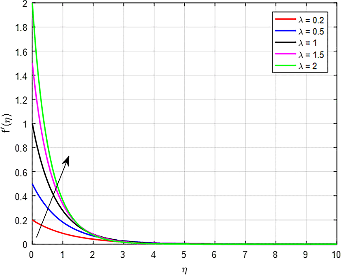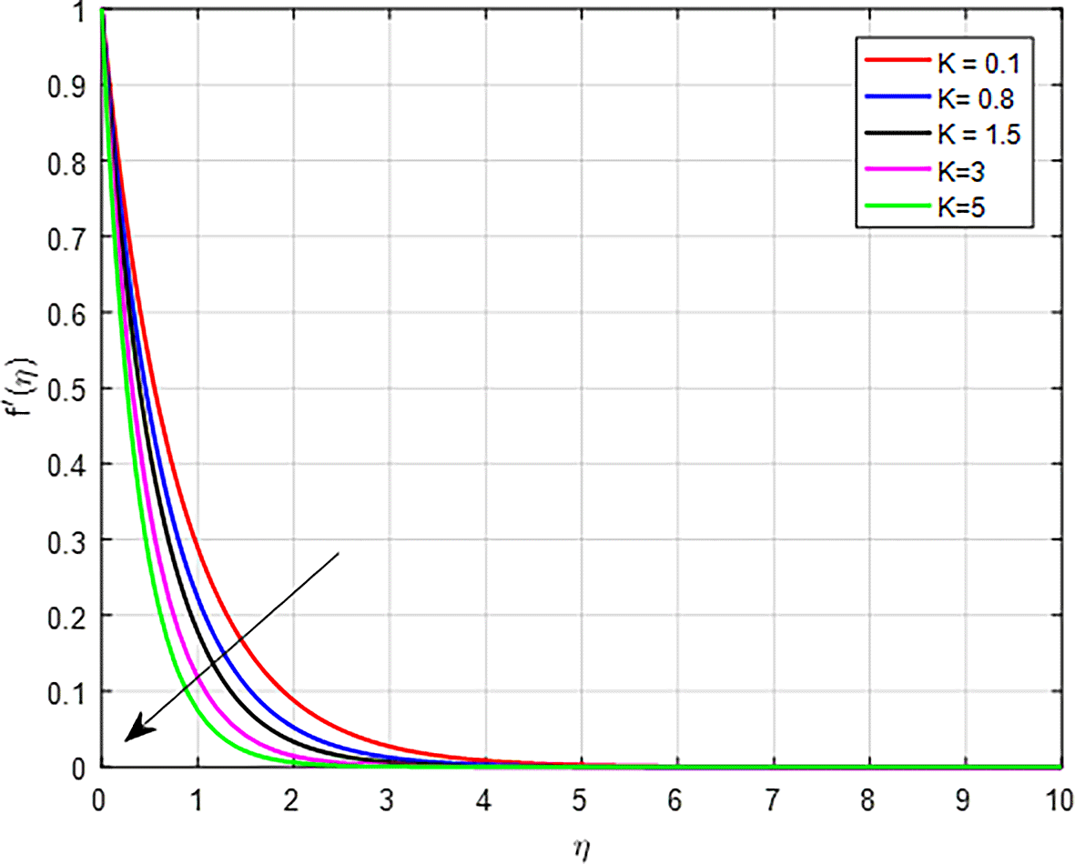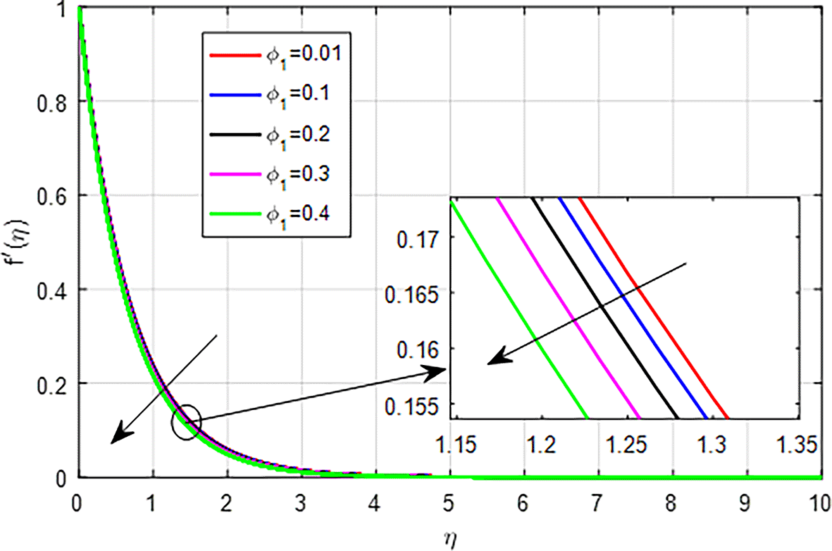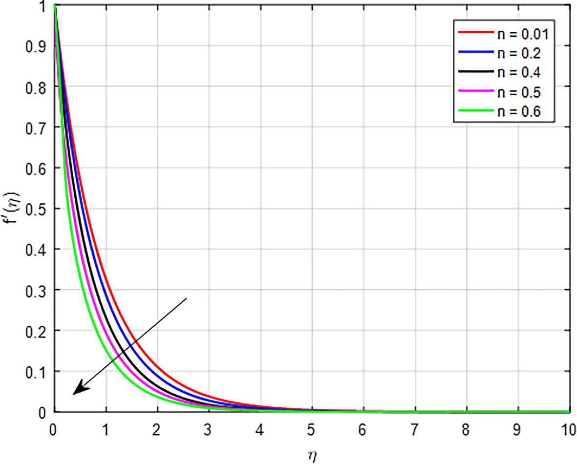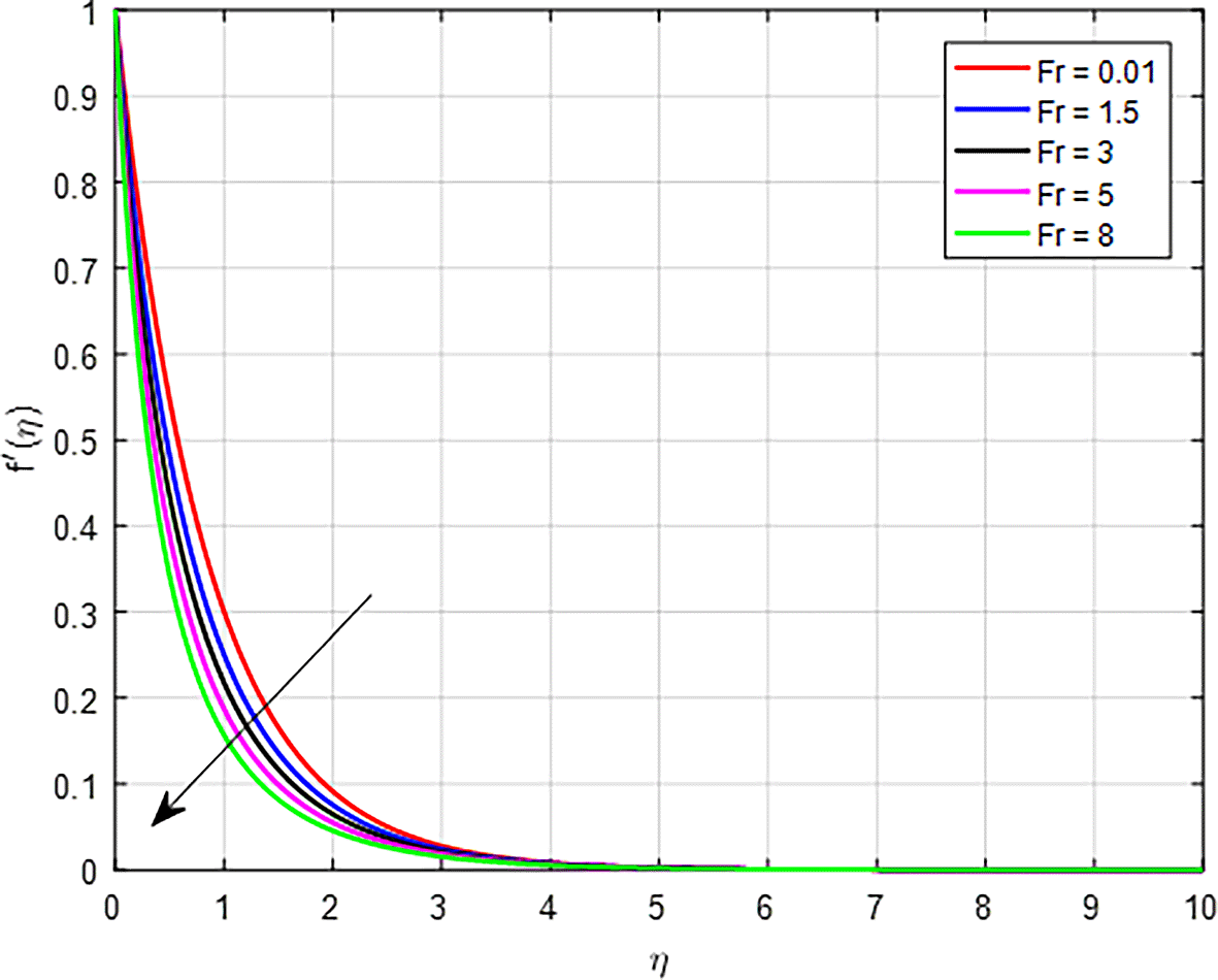 Figures 2-10 depict the influence of several factors, like: magnetic field parameter , porous permeability parameter , Weissenberg number , unsteady parameter , power law index , Forchheimer number , suction parameter , velocity ratio parameter , and nanoparticle volume fraction on scaled velocity . Figure 2 shows how the scaled velocity profile is affected by the magnetic field parameter . Physically, as the magnetic field effect increases, the interplay between the Lorentz force and the fluid’s motion leads to a decline in the velocity distribution, primarily due to increased resistance, damping effects, and changes in the dynamics of the flow. Figure 3 depict the influence of the porous permeability parameter , on the velocity profile. When the value of the porous permeability parameter increases, the velocity distribution in a fluid flow can declines. Physically, in porous media, as the permeability increases, the inertial effects may become more pronounced, particularly in non-Darcy flow regimes. This can lead to a situation where the increased inertia counteracts the driving forces, resulting in a decline in the overall velocity. Higher permeability typically allows for easier flow through the porous medium. However, if the permeability increases too much, it can lead to a decrease in the pressure gradient needed to drive the flow. This results in reduced fluid velocity as the flow becomes less confined and more dispersed within the pores. Figure 4 illustrate the impact of power law index on the velocity profile. As the power law index , increases in a tangent hyperbolic fluid, the resulting increase in viscosity and flow resistance, combined with the fluid’s non-Newtonian characteristics, leads to a decline in the velocity distribution. Figure 5 display the effect of unsteady parameter on . As the unsteady parameter increases, the balance between inertial and viscous forces shifts, leading to higher velocities due to enhanced acceleration, reduced damping, potential turbulence, and increased momentum transfer. The impact of Forchheimer parameter (Fr) on the velocity profile illustrated in Figure 6. As the Forchheimer parameter increases, the combination of heightened inertial resistance, nonlinear flow behavior, increased energy losses, and complex flow distributions contributes to a diminished velocity profile in porous media. This highlights the interplay between viscous and inertial effects in determining flow behavior. The effect of suction parameter on the velocity distribution demonstrated in Figure 7. When suction is applied to the stretching sheet, the fluid will be pulled closer to the sheet, resulting in the thinning of the boundary layer. As the suction parameter increases, the combined effects of increased resistance to flow, enhanced viscous effects, flow redistribution, boundary layer dynamics, and reduced kinetic energy contribute to a diminished velocity profile. These factors illustrate how suction influences the overall flow behavior and velocity distribution in the system. The Weissenberg number (We) is a dimensionless parameter that characterizes the relative importance of elastic (viscoelastic) effects compared to viscous effects in a fluid flow, particularly for non-Newtonian fluids such as tangent hyperbolic fluids. As the Weissenberg number increases, it indicates that the elastic effects become more significant, as depicted in Figure 8. As the Weissenberg number increases in a tangent hyperbolic fluid, the combined effects of increased elastic resistance, nonlinear flow behavior, thicker boundary layers, increased energy dissipation, and flow stabilization contribute to a diminished velocity profile. These factors highlight the complex interplay between elasticity and viscosity in determining the flow characteristics of non-Newtonian fluids. Figure 9 show the effect of the velocity ratio parameter (λ) on the velocity distribution. When the velocity ratio (λ) is high, the interactions between fluid layers (or between phases in a multiphase flow) become more dynamic. This enhances the momentum exchange, leading to higher velocities being transmitted through the flow field, thus increasing the overall velocity profile. As in Figure 10, as nanoparticle volume fraction (ϕ1) increases, the interplay of increased viscosity, enhanced drag, altered fluid structure, and boundary effects collectively results in a decrease in the velocity profile of the fluid. Figure 11 depict the comparison of nanofluid (Al2O3/C2H6O2), hybrid nanofluid (Al2O3 − Cu/C2H6O2), and ternary hybrid nanofluid (Al2O3 − Cu − TiO2/C2H6O2) on the velocity distribution. When the concentration of nanoparticles in nanofluids, hybrid nanofluids, and ternary hybrid nanofluids increases, the velocity pro- file typically decreases due to increased viscosity, enhanced drag forces, complex microstructural changes, potential shear-thickening effects, and shifts in flow regime. These factors collectively hinder the smooth flow of the fluid, resulting in lower velocities. Ternary hybrid nanofluids often achieve the best velocity distribution among the three categories. The synergistic effects of multiple nanoparticles can enhance dispersion stability and thermal performance while managing viscosity better. This results in improved flow characteristics and potentially higher velocities compared to the other two types.