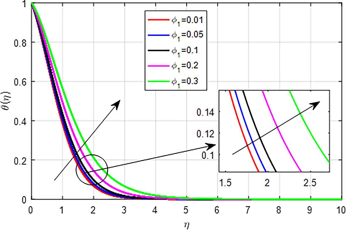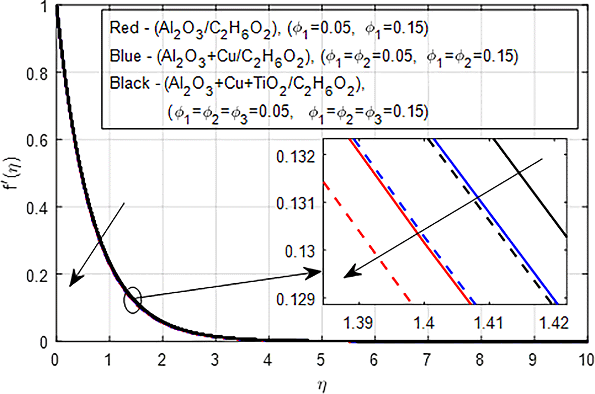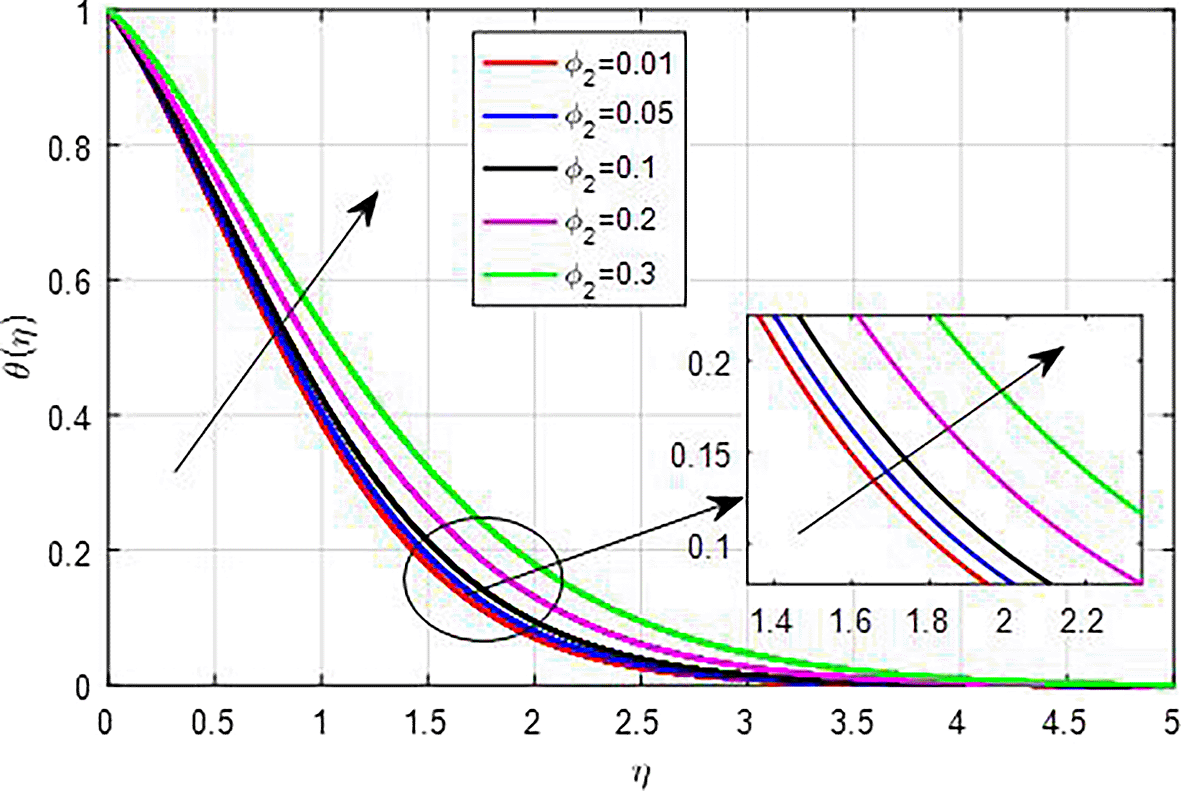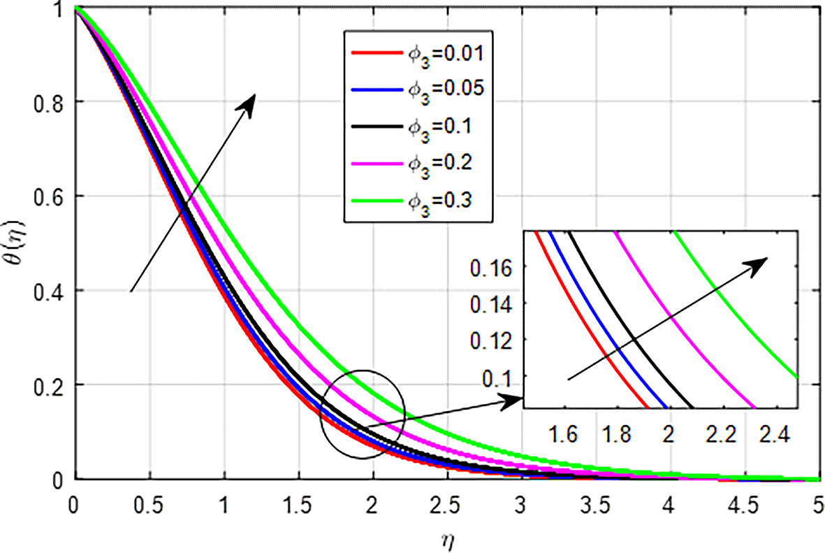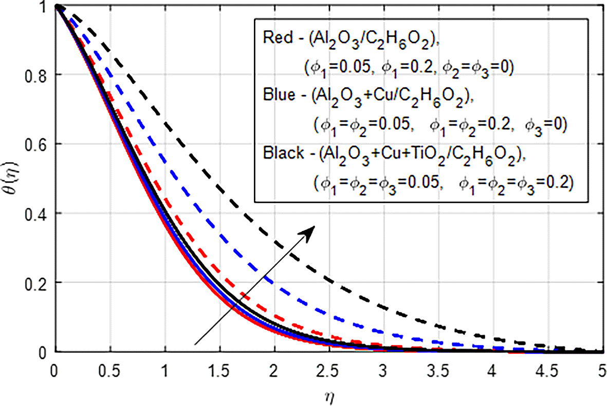 • As the volume fraction of nanoparticles increases in nanofluids, hybrid nanofluids, and ternary hybrid nanofluids, the temperature profile increases due to improved thermal conductivity, enhanced viscous dissipation, and better convective heat transfer.