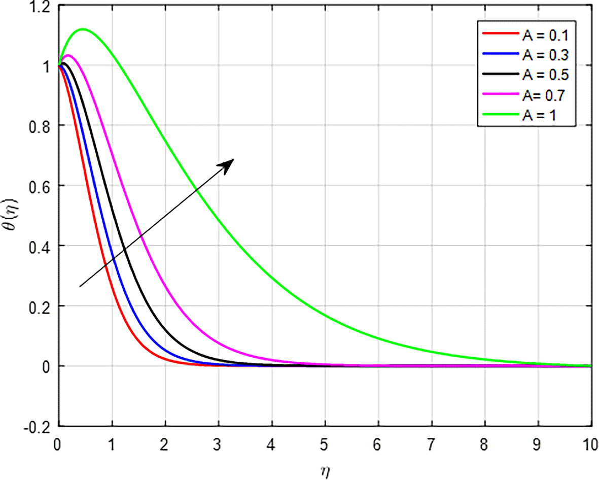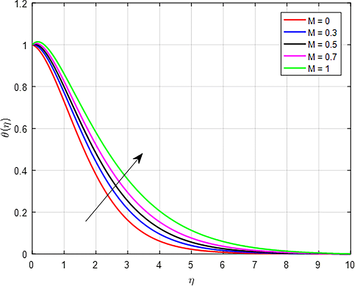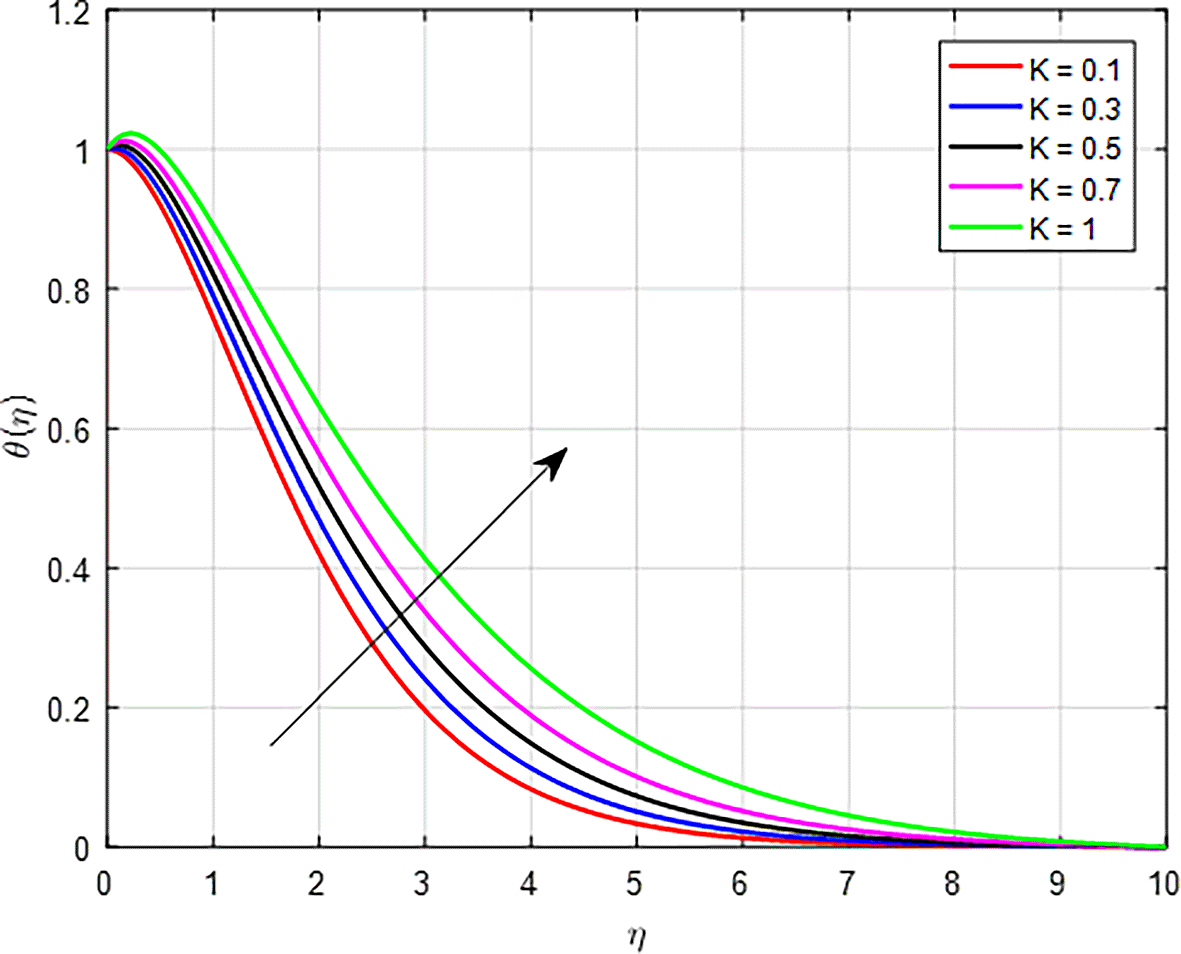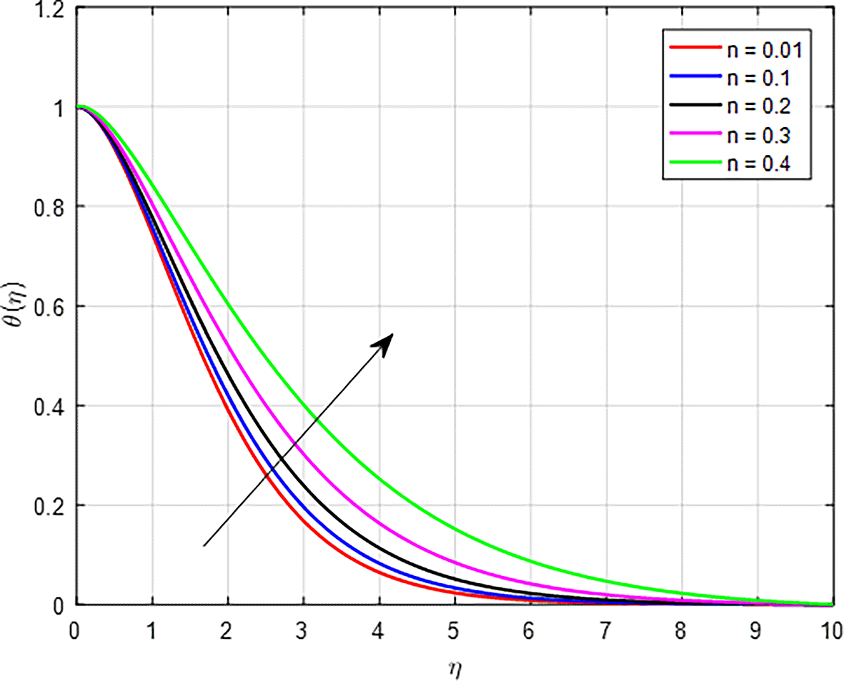 The effects of the nonlinear thermal radiation parameter (R) on fluid temperatures are illustrated in Figure 12. When the values of nonlinear thermal radiation increase, the temperature profile in a fluid or material can also increase. In materials where radiation is a primary mode of heat transfer, an increase in nonlinear thermal radiation means that more energy is available to heat the material. This can lead to higher thermal gradients within the material, resulting in an overall increase in the temperature profile. Figure 13 depicts the thermal distribution against the temperature ratio . The temperature ratio often refers to the ratio of the temperature of a fluid to that of a boundary or a reference temperature. An increased temperature ratio implies a greater difference between the fluid temperature and a reference or surrounding temperature. This enhanced temperature gradient can lead to more efficient heat transfer from the hotter regions to the cooler ones, resulting in higher temperatures throughout the fluid or material. When the values of the unsteady parameter increase, the temperature profile in a fluid or material can also increase due to several interrelated mechanisms, as shown in Figure 14. The unsteady parameter often reflects the importance of transient effects relative to steady-state conditions, such as in heat transfer or fluid dynamics. An increase in the unsteady parameter can lead to a higher temperature profile through enhanced energy transport, rapid response to thermal gradients, and increased effective thermal conductivity. These factors illustrate the critical role that unsteady conditions play in influencing the thermal behavior of fluids and materials. Figure 15 present the effect of the thermophoresis diffusion on the temperature profile. As the thermophoresis diffusion parameter increases, particles within the fluid experience a stronger thermophoresis force, which causes them to migrate from regions of lower temperature to regions of higher temperature. This movement can lead to a concentration of particles in hotter areas, effectively increasing the local temperature in those regions. The influence of Brownian motion on the temperature distribution, as shown in Figure 16. As the Brownian diffusion parameter increases, the microscopic motion of particles (due to Brownian motion) becomes more significant. This enhanced movement leads to improved mixing within the fluid, promoting more uniform temperature distribution and potentially raising the average temperature profile by allowing hotter regions to mix with cooler ones more effectively. As we can see from the temperature distribution graphs in Figure 17, the temperature functions get better as the Eckert number (Ec) increases in value. The Eckert number (Ec) is a dimensionless parameter that characterizes the relative importance of kinetic energy to thermal energy in a fluid flow, particularly in situations involving heat transfer. As the Eckert number rises, the kinetic energy associated with the flow increases. This kinetic energy can contribute to the overall thermal energy of the fluid, leading to higher temperatures, especially if the kinetic energy is converted into internal energy during viscous dissipation. The significance of the porous permeability media parameter (K) on temperature profiles is depicted in Figure 18. When the porous permeability parameter (K) increases, the temperature profile in a fluid flowing through a porous medium can also increase. In porous media, higher permeability often means a more interconnected pore structure. This can provide a larger surface area for heat exchange between the fluid and the solid matrix of the medium, enhancing heat transfer efficiency and contributing to a higher temperature profile. As Figure 19 illustrate, the temperature increases as the magnetic field parameter (M) increases. As the magnetic field strength increases, it can exert a damping effect on the fluid flow. This damping can reduce the velocity of the fluid, leading to increased viscous heating. The kinetic energy of the fluid being converted into thermal energy due to viscous dissipation results in a higher temperature profile. Figure 20 shows a graph of the temperature profile as a result of the increasing the power law index . An increase in the power law index parameter , can lead to a higher temperature profile through increased viscosity and viscous heating, reduced flow velocity resulting in enhanced energy dissipation, altered heat transfer characteristics, greater thermal energy retention, improved mixing and flow stability, and interactions with temperature gradients. These factors collectively illustrate how non-Newtonian fluid behavior influences thermal dynamics within the flow. The effect of the Forchheimer number (Fr) on the temperature distribution, demonstrated in Figure 21. When the Forchheimer number increases, it indicates that inertial forces are becoming more significant compared to viscous forces. As inertial forces become more dominant, the mixing and transport of thermal energy are enhanced. The increased movement of the fluid helps distribute heat more uniformly, resulting in a higher average temperature within the porous medium. As in Figure 22, an increase in the Prandtl number indicates that the kinematic viscosity is relatively high compared to thermal diffusivity. This means that momentum diffuses more slowly than heat. Higher viscosity can lead to reduced flow velocities, which can decrease the fluid’s ability to carry heat away from hot regions, resulting in a less effective temperature distribution. Figure 23 show the effect of the heat generation on the temperature profile. Increasing the rate of heat generation results in a direct increase in thermal energy, leading to higher temperatures in the fluid or material. This effect is reinforced by heat transfer mechanisms, thermal gradients, and material properties, all contributing to a rising te