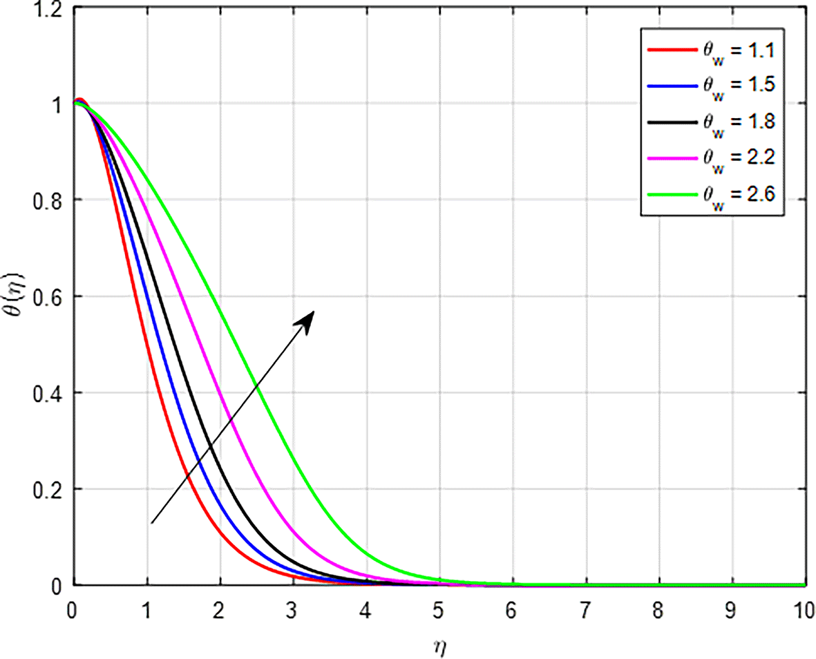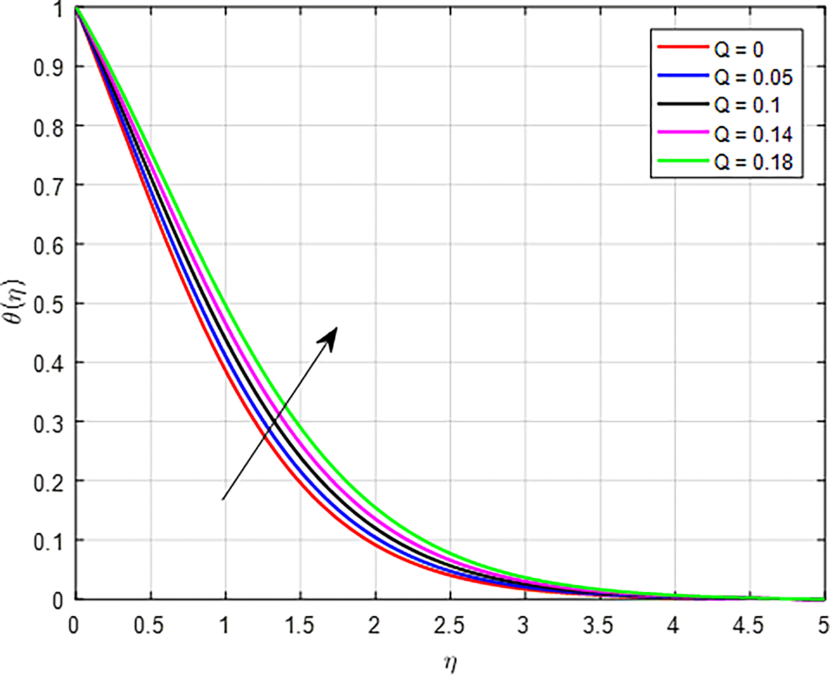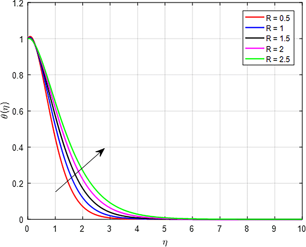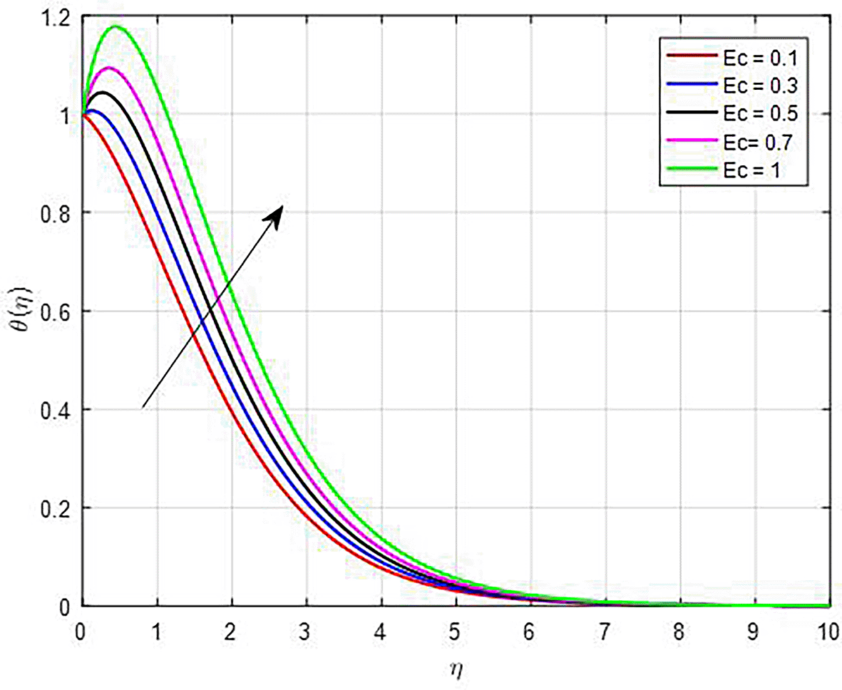 The effects of the nonlinear thermal radiation parameter (R) on fluid temperatures are illustrated in Figure 12. When the values of nonlinear thermal radiation increase, the temperature profile in a fluid or material can also increase. In materials where radiation is a primary mode of heat transfer, an increase in nonlinear thermal radiation means that more energy is available to heat the material. This can lead to higher thermal gradients within the material, resulting in an overall increase in the temperature profile. Figure 13 depicts the thermal distribution against the temperature ratio . The temperature ratio often refers to the ratio of the temperature of a fluid to that of a boundary or a reference temperature. An increased temperature ratio implies a greater difference between the fluid temperature and a reference or surrounding temperature. This enhanced temperature gradient can lead to more efficient heat transfer from the hotter regions to the cooler ones, resulting in higher temperatures throughout the fluid or material. When the values of the unsteady parameter increase, the temperature profile in a fluid or material can also increase due to several interrelated mechanisms, as shown in Figure 14. The unsteady parameter often reflects the importance of transient effects relative to steady-state conditions, such as in heat transfer or fluid dynamics. An increase in the unsteady parameter can lead to a higher temperature profile through enhanced energy transport, rapid response to thermal gradients, and increased effective thermal conductivity. These factors illustrate the critical role that unsteady conditions play in influencing the thermal behavior of fluids and materials. Figure 15 present the effect of the thermophoresis diffusion on the temperature profile. As the thermophoresis diffusion parameter increases, particles within the fluid experience a stronger thermophoresis force, which causes them to migrate from regions of lower temperature to regions of higher temperature. This movement can lead to a concentration of particles in hotter areas, effectively increasing the local temperature in those regions. The influence of Brownian motion on the temperature distribution, as shown in Figure 16. As the Brownian diffusion parameter increases, the microscopic motion of particles (due to Brownian motion) becomes more significant. This enhanced movement leads to improved mixing within the fluid, promoting more uniform temperature distribution and potentially raising the average temperature profile by allowing hotter regions to mix with cooler ones more effectively. As we can see from the temperature distribution graphs in Figure 17, the temperature functions get better as the Eckert number (Ec) increases in value. The Eckert number (Ec) is a dimensionless parameter that characterizes the relative importance of kinetic energy to thermal energy in a fluid flow, particularly in situations involving heat transfer. As the Eckert number rises, the kinetic energy associated with the flow increases. This kinetic energy can contribute to the overall thermal energy of the fluid, leading to higher temperatures, especially if the kinetic energy is converted into internal energy during viscous dissipation. The significance of the porous permeability media parameter (K) on temperature profiles is depicted in Figure 18. When the porous permeability parameter (K) increases, the temperature profile in a fluid flowing through a porous medium can also increase. In porous media, higher permeability often means a more interconnected pore structure. This can provide a larger surface area for heat exchange between the fluid and the solid matrix of the medium, enhancing heat transfer efficiency and contributing to a higher temperature profile. As Figure 19 illustrate, the temperature increases as the magnetic field parameter (M) increases. As the magnetic field strength increases, it can exert a damping effect on the fluid flow. This damping can reduce the velocity of the fluid, leading to increased viscous heating. The kinetic energy of the fluid being converted into thermal energy due to viscous dissipation results in a higher temperature profile. Figure 20 shows a graph of the temperature profile as a result of the increasing the power law index . An increase in the power law index parameter , can lead to a higher temperature profile through increased viscosity and viscous heating, reduced flow velocity resulting in enhanced energy dissipation, altered heat transfer characteristics, greater thermal energy retention, improved mixing and flow stability, and interactions with temperature gradients. These factors collectively illustrate how non-Newtonian fluid behavior influences thermal dynamics within the flow. The effect of the Forchheimer number (Fr) on the temperature distribution, demonstrated in Figure 21. When the Forchheimer number increases, it indicates that inertial forces are becoming more significant compared to viscous forces. As inertial forces become more dominant, the mixing and transport of thermal energy are enhanced. The increased movement of the fluid helps distribute heat more uniformly, resulting in a higher average temperature within the porous medium. As in Figure 22, an increase in the Prandtl number indicates that the kinematic viscosity is relatively high compared to thermal diffusivity. This means that momentum diffuses more slowly than heat. Higher viscosity can lead to reduced flow velocities, which can decrease the fluid’s ability to carry heat away from hot regions, resulting in a less effective temperature distribution. Figure 23 show the effect of the heat generation on the temperature profile. Increasing the rate of heat generation results in a direct increase in thermal energy, leading to higher temperatures in the fluid or material. This effect is reinforced by heat transfer mechanisms, thermal gradients, and material properties, all contributing to a rising te