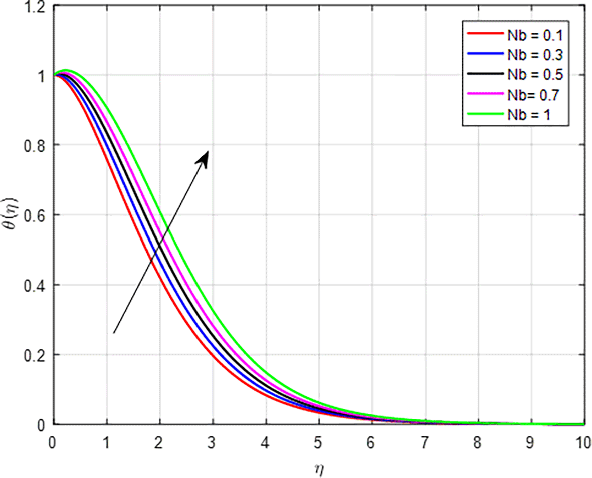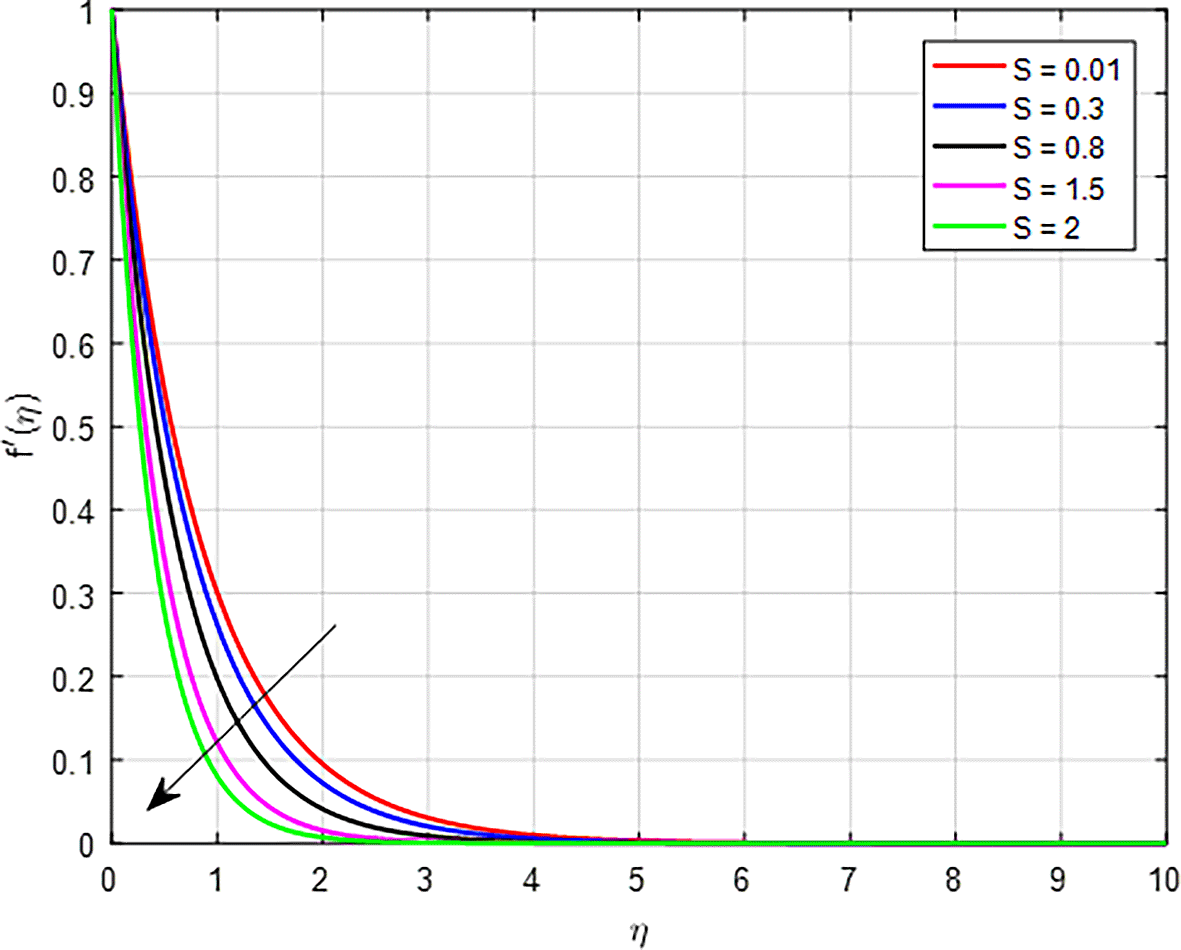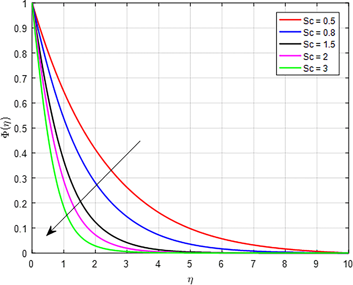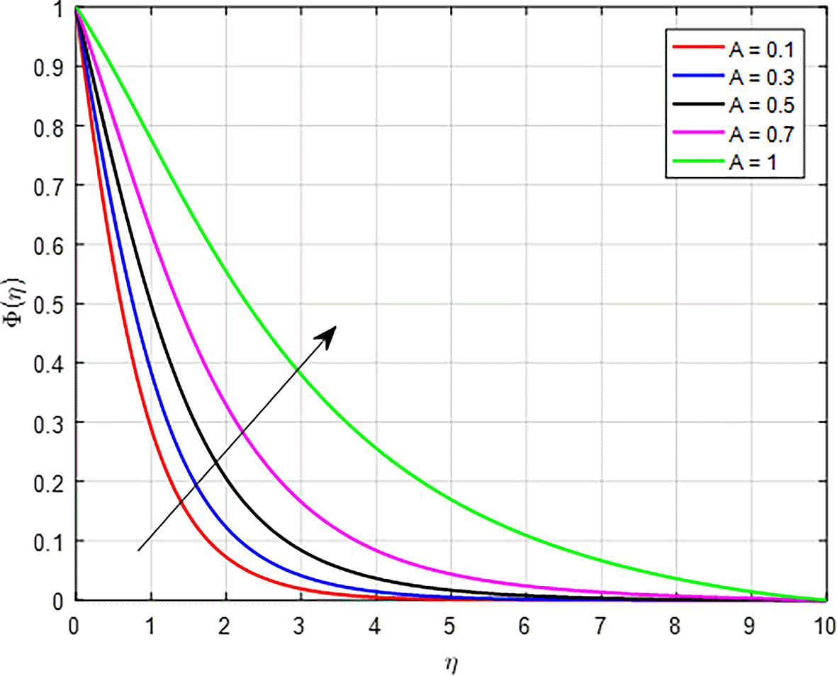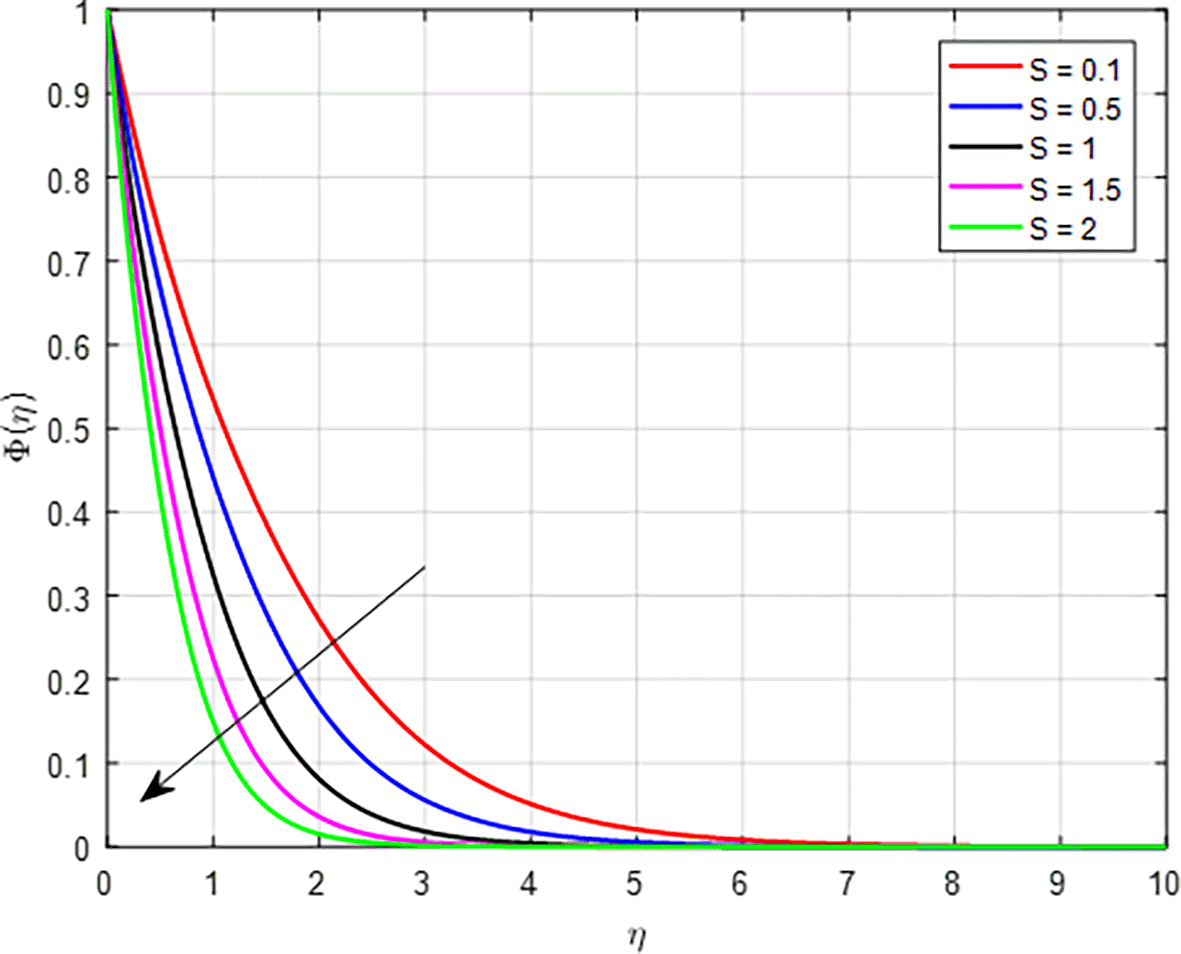 The effect of the thermophoresis diffusion parameter (Nt) on the concentration profile, as illustrated in Figure 30. As the thermophoresis parameter increases, the transport of particles within the fluid becomes more effective. This enhanced transport allows for a greater number of particles to move towards and concentrate in regions of higher temperature, further increasing the concentration profile. Figure 31 illustrate the impact of the Brownian diffusion Parameter (Nb) on the concentration profile. When the Brownian diffusion parameter (Nb) increases, it indicates a stronger influence of Brownian motion on the transport of particles suspended in a fluid. As Brownian diffusion increases, particles undergo more vigorous random motion. This enhanced diffusion can cause particles to spread out more rapidly within the fluid, leading to a decrease in local concentration as particles move away from regions of higher concentration. Figure 32 depict the effect of the Schmidt number (Sc) on the concentration profile. The Schmidt number (Sc) is a dimensionless parameter that characterizes the relative importance of momentum diffusion (viscous effects) to mass diffusion (concentration effects) in a fluid. When the Schmidt number increases, it typically indicates that momentum diffusion is more significant compared to mass diffusion. When momentum diffusion dominates, it can lead to smaller concentration gradients because the particles are less able to respond to local variations in concentration. This smaller gradient reduces the driving force for diffusion, causing a decrease in the concentration profile over time as the particles do not accumulate effectively. Figure 33 show the effect of the unsteady parameter (A) on the concentration profile. When the unsteady parameter (A) increases, it typically indicates that transient effects in the system are becoming more significant compared to steady-state effects. The unsteady parameter affects how particles are transported in the fluid. With higher values of the unsteady parameter, the transport mechanisms (like diffusion and convection) can operate differently, potentially leading to increased mixing or accumulation of particles in certain areas, thereby increasing the concentration profile. Figure 34 present that when the chemical reaction parameter increases, the solute’s boundary layer thickness decreases. In reactions where the concentration of a reactant decreases as it transforms into products, an increase in the chemical reaction parameter means that the reactants are being converted to products more rapidly. This results in a lower concentration of the reactant remaining in the system, causing the overall concentration profile to decline. Figure 35 depict the effect of suction parameter (S) on the concentration profile. As the values of the suction parameter increase, the concentration profile decreases due to the removal of fluid that carries solutes, leading to a reduction in local concentration. This effect is further amplified by the dynamics of the concentration boundary layer and enhanced mass transfer away from the surface that prioritize the extraction of fluid over the retention of solutes. Consequently, the overall concentration profile in the fluid becomes lower with increased suction.
