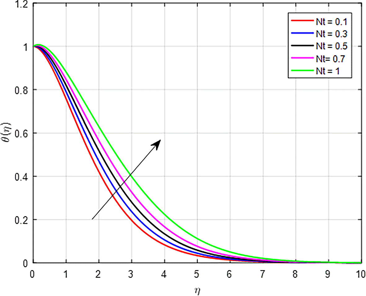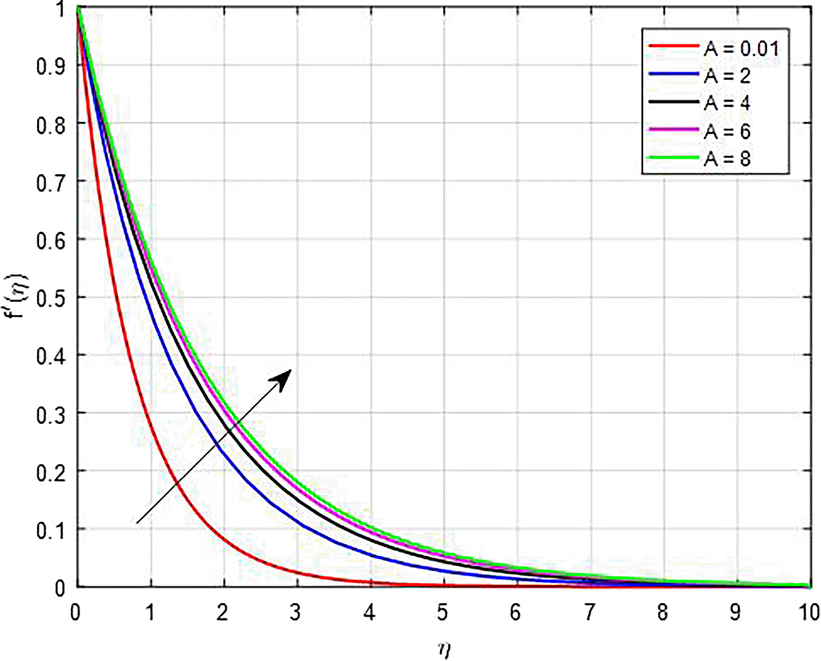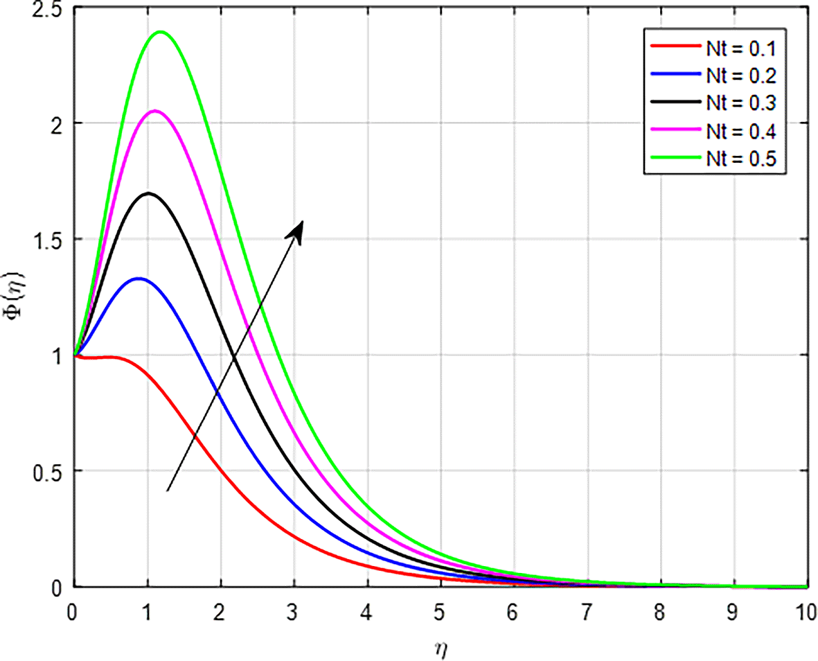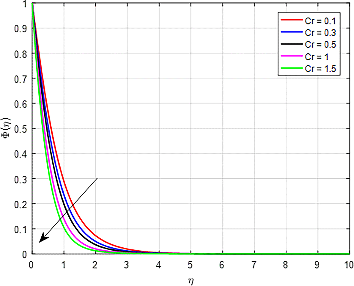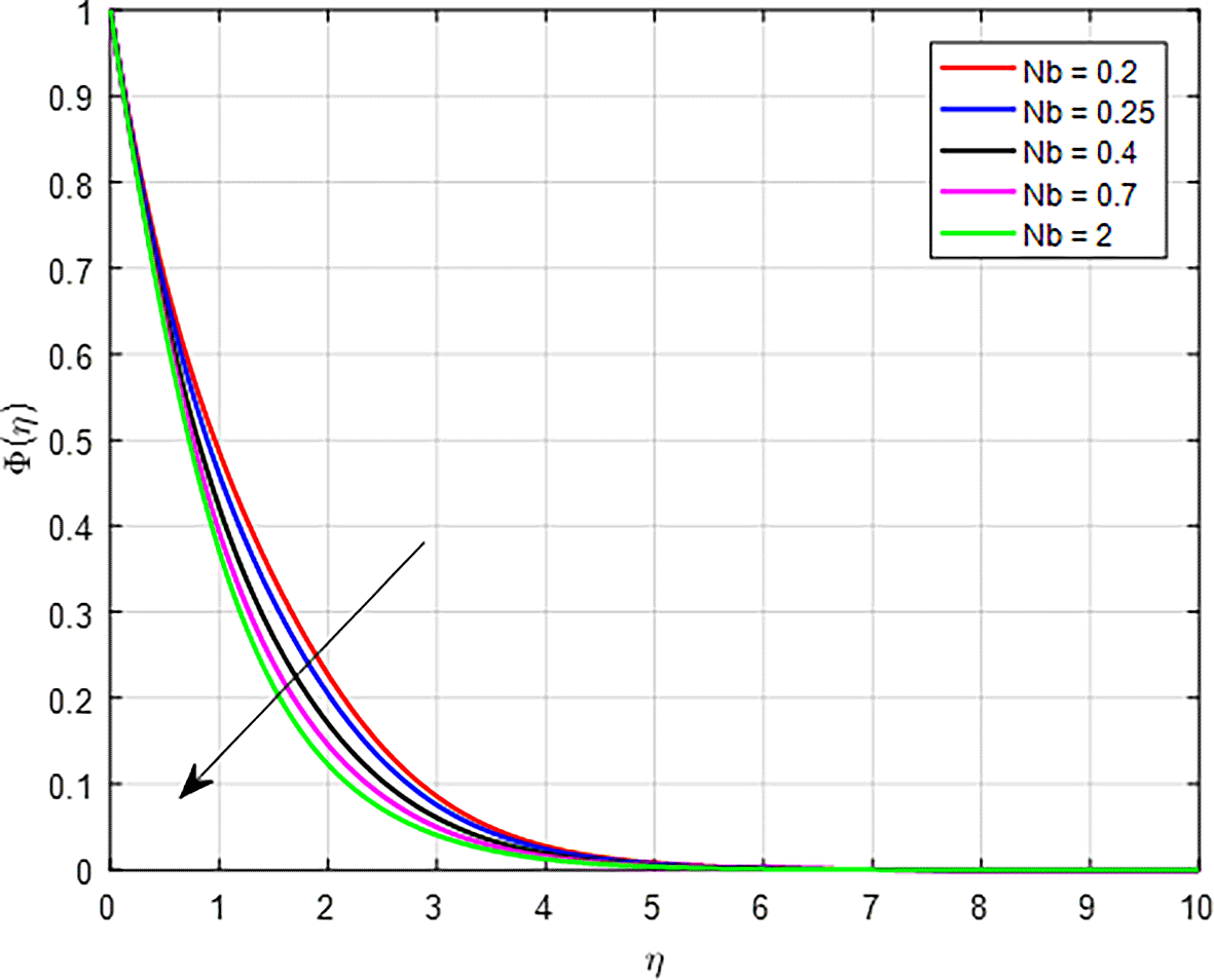 The effect of the thermophoresis diffusion parameter (Nt) on the concentration profile, as illustrated in Figure 30. As the thermophoresis parameter increases, the transport of particles within the fluid becomes more effective. This enhanced transport allows for a greater number of particles to move towards and concentrate in regions of higher temperature, further increasing the concentration profile. Figure 31 illustrate the impact of the Brownian diffusion Parameter (Nb) on the concentration profile. When the Brownian diffusion parameter (Nb) increases, it indicates a stronger influence of Brownian motion on the transport of particles suspended in a fluid. As Brownian diffusion increases, particles undergo more vigorous random motion. This enhanced diffusion can cause particles to spread out more rapidly within the fluid, leading to a decrease in local concentration as particles move away from regions of higher concentration. Figure 32 depict the effect of the Schmidt number (Sc) on the concentration profile. The Schmidt number (Sc) is a dimensionless parameter that characterizes the relative importance of momentum diffusion (viscous effects) to mass diffusion (concentration effects) in a fluid. When the Schmidt number increases, it typically indicates that momentum diffusion is more significant compared to mass diffusion. When momentum diffusion dominates, it can lead to smaller concentration gradients because the particles are less able to respond to local variations in concentration. This smaller gradient reduces the driving force for diffusion, causing a decrease in the concentration profile over time as the particles do not accumulate effectively. Figure 33 show the effect of the unsteady parameter (A) on the concentration profile. When the unsteady parameter (A) increases, it typically indicates that transient effects in the system are becoming more significant compared to steady-state effects. The unsteady parameter affects how particles are transported in the fluid. With higher values of the unsteady parameter, the transport mechanisms (like diffusion and convection) can operate differently, potentially leading to increased mixing or accumulation of particles in certain areas, thereby increasing the concentration profile. Figure 34 present that when the chemical reaction parameter increases, the solute’s boundary layer thickness decreases. In reactions where the concentration of a reactant decreases as it transforms into products, an increase in the chemical reaction parameter means that the reactants are being converted to products more rapidly. This results in a lower concentration of the reactant remaining in the system, causing the overall concentration profile to decline. Figure 35 depict the effect of suction parameter (S) on the concentration profile. As the values of the suction parameter increase, the concentration profile decreases due to the removal of fluid that carries solutes, leading to a reduction in local concentration. This effect is further amplified by the dynamics of the concentration boundary layer and enhanced mass transfer away from the surface that prioritize the extraction of fluid over the retention of solutes. Consequently, the overall concentration profile in the fluid becomes lower with increased suction.