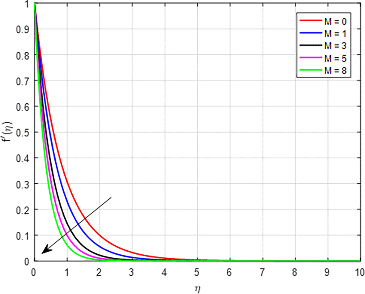 • As the magnetic field effect intensifies, the interaction between the Lorentz force and the fluid’s motion results in a reduction in the velocity distribution. As the Forchheimer parameter increases, the combination of enhanced inertial resistance, nonlinear flow behavior, increased energy losses, and complex flow distributions results in a reduced velocity profile in porous media.