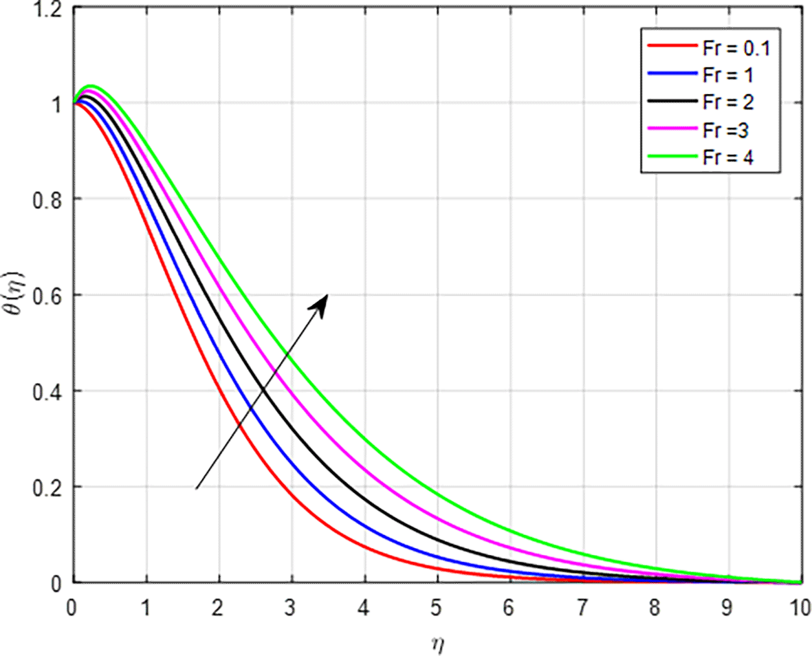 • When the non-linear thermal radiation parameter, temperature ratio parameter , heat generation (Q0 > 0), Brownian motion parameter, thermophoresis parameter, magnetic field parameter, Forchheimer number (Fr), and Eckert number increases, the temperature profile rises. The temperature profile diminishes, when the Prandtl number increases.