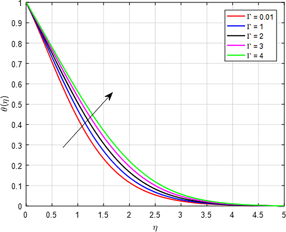 • When the variable thermal conductivity parameter (Γ) increases, the temperature profile typically rises, reflecting the improved heat transfer capabilities of the material or fluid.