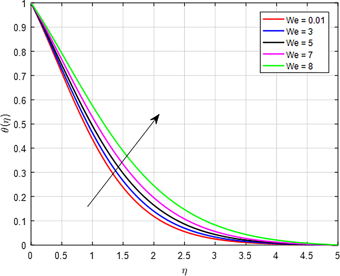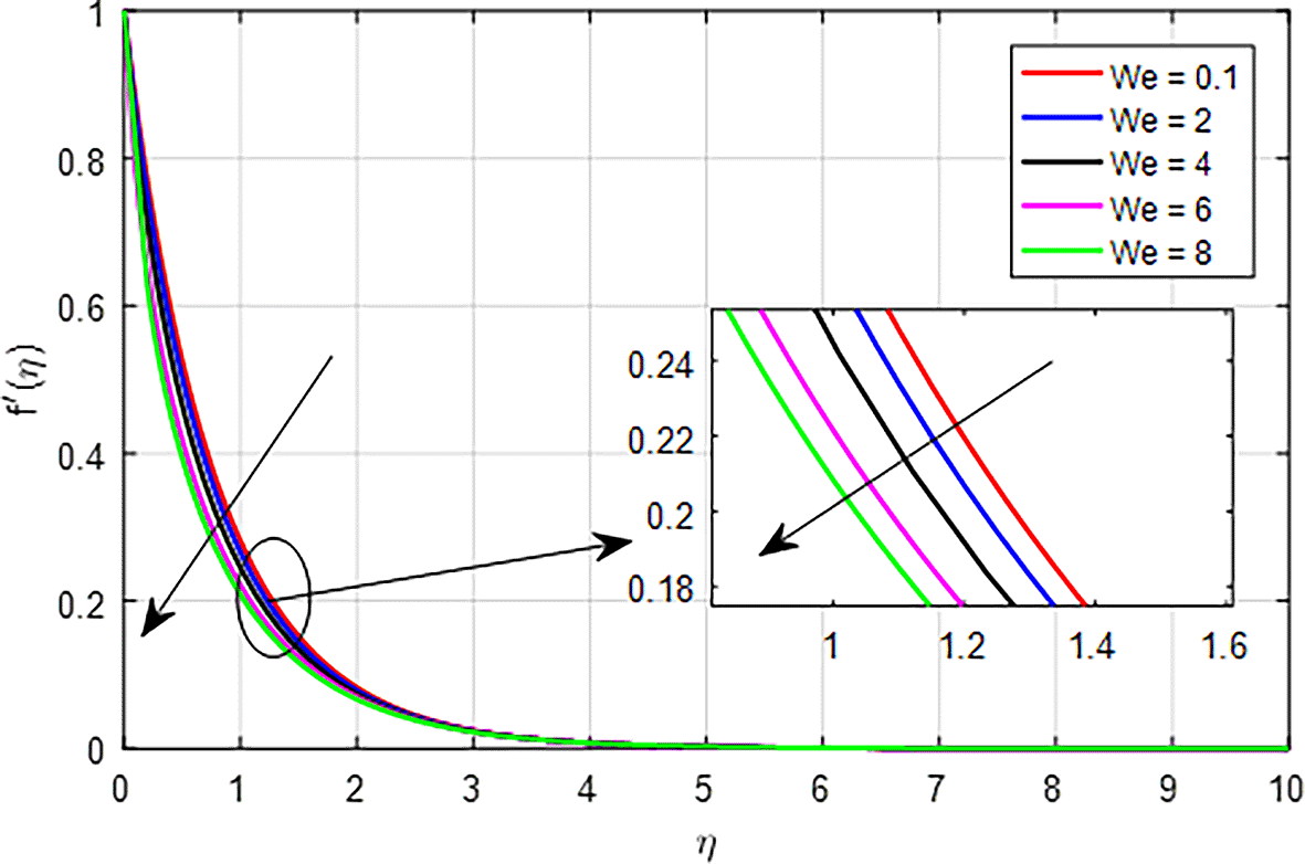 • As the Weissenberg number rises in a tangent hyperbolic fluid, the resulting interplay of greater elastic resistance, nonlinear flow behavior, thicker boundary layers, heightened energy dissipation, and flow stabilization leads to a reduced velocity profile.
