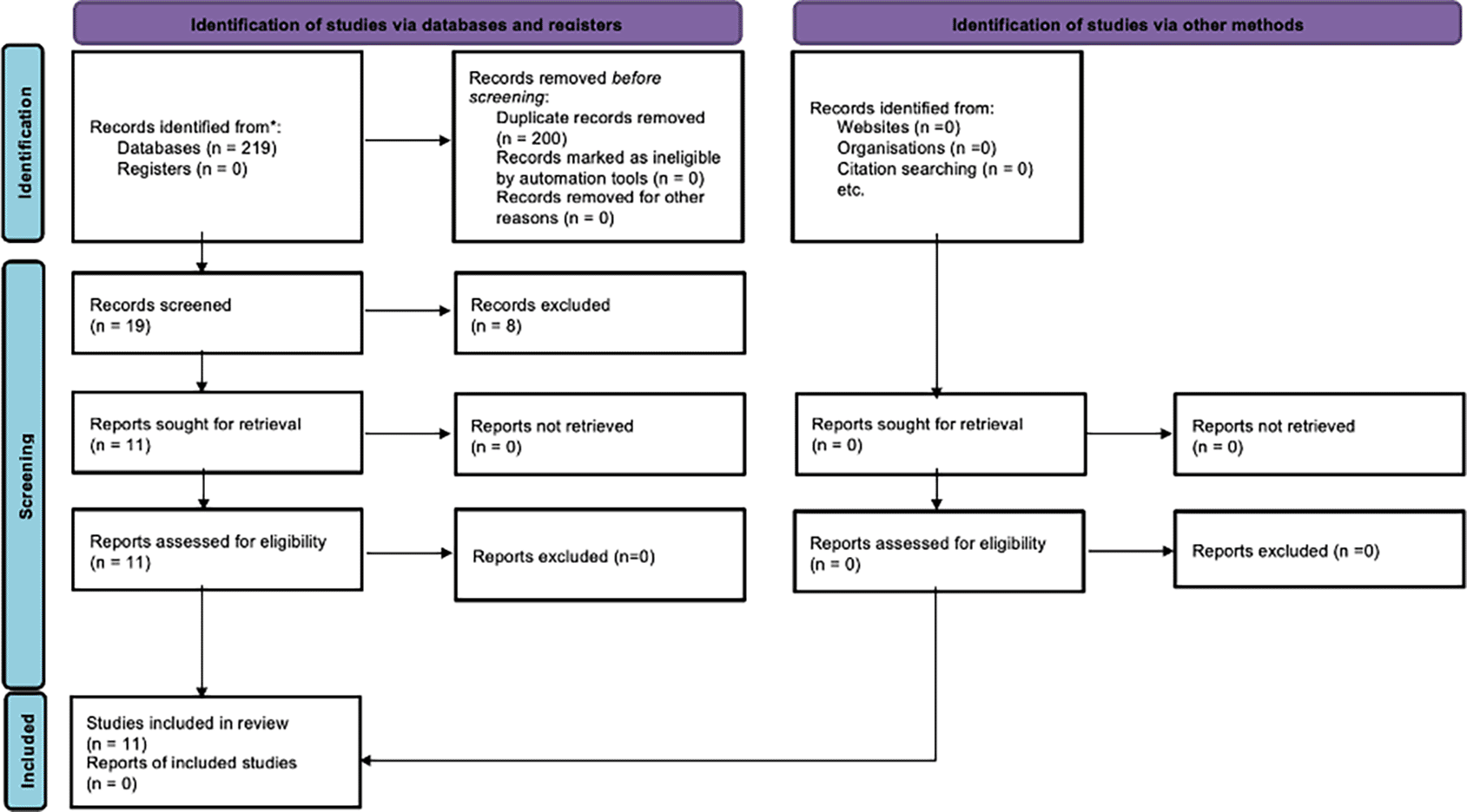 The initial search across six electronic databases yielded a total of 219 articles, of which 200 were duplicates. After screening the titles and abstracts of the remaining articles, we identified 19 studies that aligned with the criteria set by our systematic review’s PICO framework. However, upon conducting a thorough analysis of the full-text articles, only eleven met our PICO criteria, while the remaining eight studies did not meet the inclusion criteria for this review ( Figure 2).