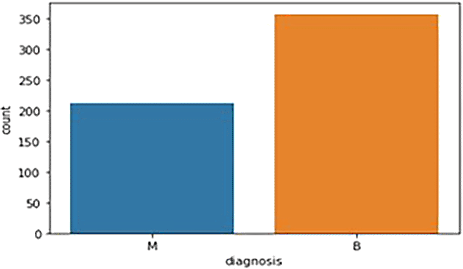 The breast cancer dataset (569 samples, 32 features) underwent thorough exploratory data analysis (EDA) to assess structure and identify key features. Two redundant columns, “id” and “Unnamed: 32” (containing only NaN values), were removed during data cleaning. The target variable, “diagnosis,” was analyzed, revealing 59% malignant (M) and 41% benign (B) cases. A bar graph ( Figure 1) illustrates this distribution. Following data cleaning, the dataset was divided into feature variables (X) and the target variable (y), ensuring all numeric features remained in X while the categorical “diagnosis” variable was placed in y.