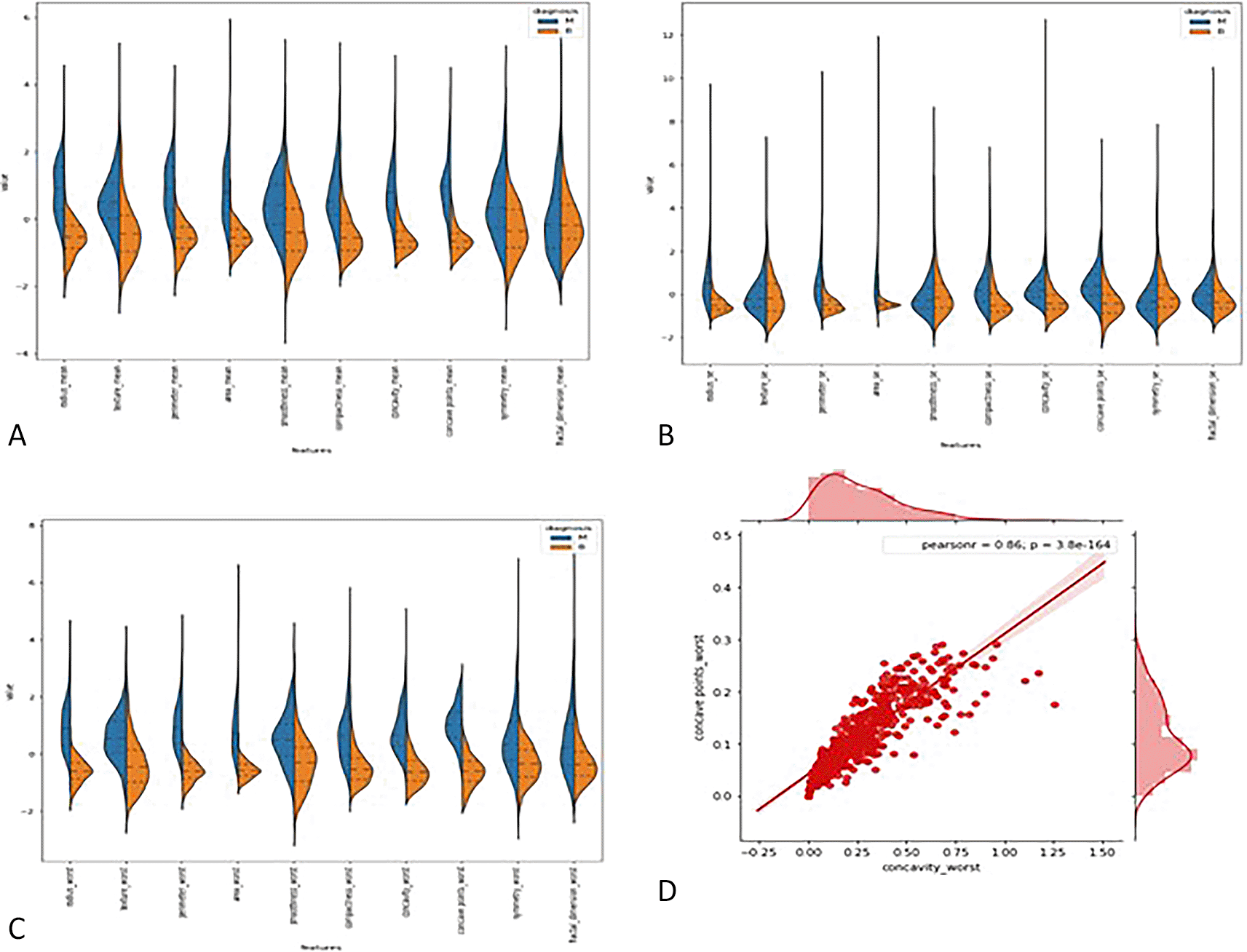3.2.2 Joint plot: - A joint plot was used to analyze the relationship between concavity worst and concave points worst, as their distributions appeared to be similar. The joint plot, which combines scatter plots and histograms, provides a comprehensive view of the data’s distribution and the relationship between two variables. The analysis revealed a strong correlation of 0.86 between the two features, accompanied by a statistically significant p-value. This indicates a high degree of linear association between concavity worst and concave points worst, suggesting that they capture similar information regarding the tumor characteristics. Given their strong correlation, retaining only one of these features in the classification model is advisable, as including both would introduce redundancy and not contribute additional discriminative power in Figure 2(D).