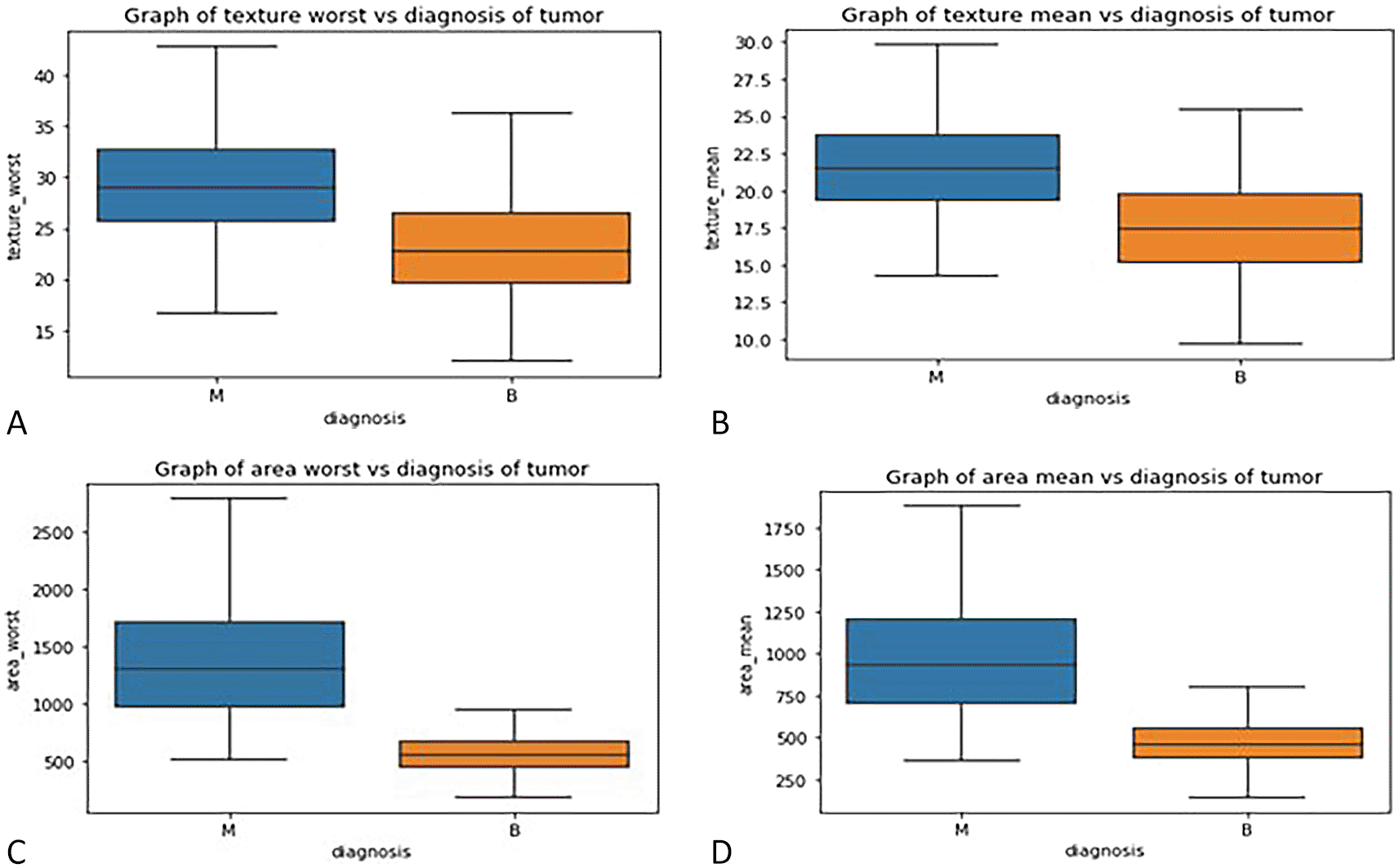 In this study, box plots were employed to explore the relationship between highly correlated features in the correlation matrix, such as texture mean and texture worst, as well as area mean and area worst. The analysis of these features in relation to the diagnosis column revealed similar distributions for malignant and benign tumors, indicating redundancy in the information they provide. For instance, texture mean and texture worst showed comparable distributions, suggesting that retaining both features in the model would likely result in redundancy. Consequently, one of these highly correlated features can be excluded from the classification process without sacrificing predictive power. These insights were further validated through the visual examination of box plots, which helped clarify how each feature discriminates between malignant and benign groups in Figure 3(A, B, C, D).