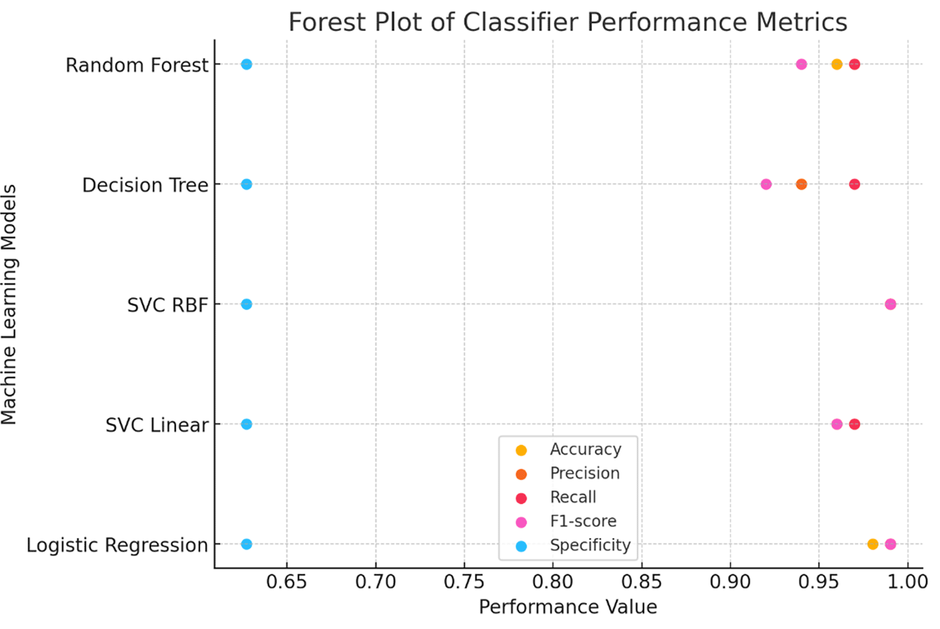 To further assess the quality of predictions, additional metrics such as precision, sensitivity (recall), F1 score, and specificity were calculated using the classification report function from the sklearn metrics package. These metrics evaluate the balance between true positive predictions and false positives/negatives, providing a comprehensive assessment of the classification algorithms The Support Vector Classifier with Radial Basis Function (SVC RBF) demonstrated the highest testing accuracy (0.9868) and consistently high precision, recall, F1 score, and specificity, establishing itself as the most robust classifier in this study. Logistic Regression performed comparably, achieving a testing accuracy of 0.9825, indicating reliable classification performance. In contrast, the Decision Tree Classifier, despite achieving the highest training accuracy (1.0), exhibited the lowest testing accuracy (0.9429), suggesting potential overfitting during training. The Random Forest classifier displayed a balanced performance, with a testing accuracy of 0.9561 and comparable metrics across precision, recall, and F1 score, making it a reliable but less optimal choice than SVC RBF and Logistic Regression in Table 2.