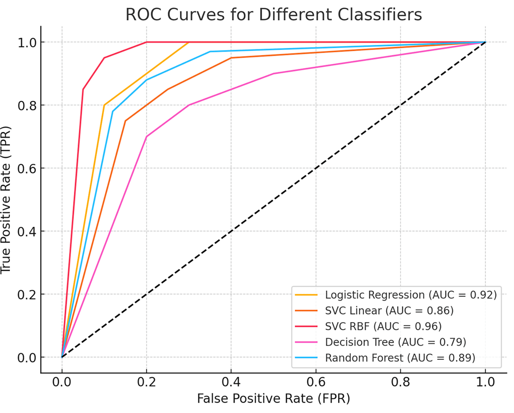 Five supervised machine learning algorithms were implemented: Logistic Regression, Support Vector Classification (SVC) with linear and radial basis function (RBF) kernels, Decision Tree, and Random Forest. The dataset was split (60:40) into training and testing subsets using Scikit-learn’s train test split Models were trained on the training set and optimized using hyperparameter tuning.