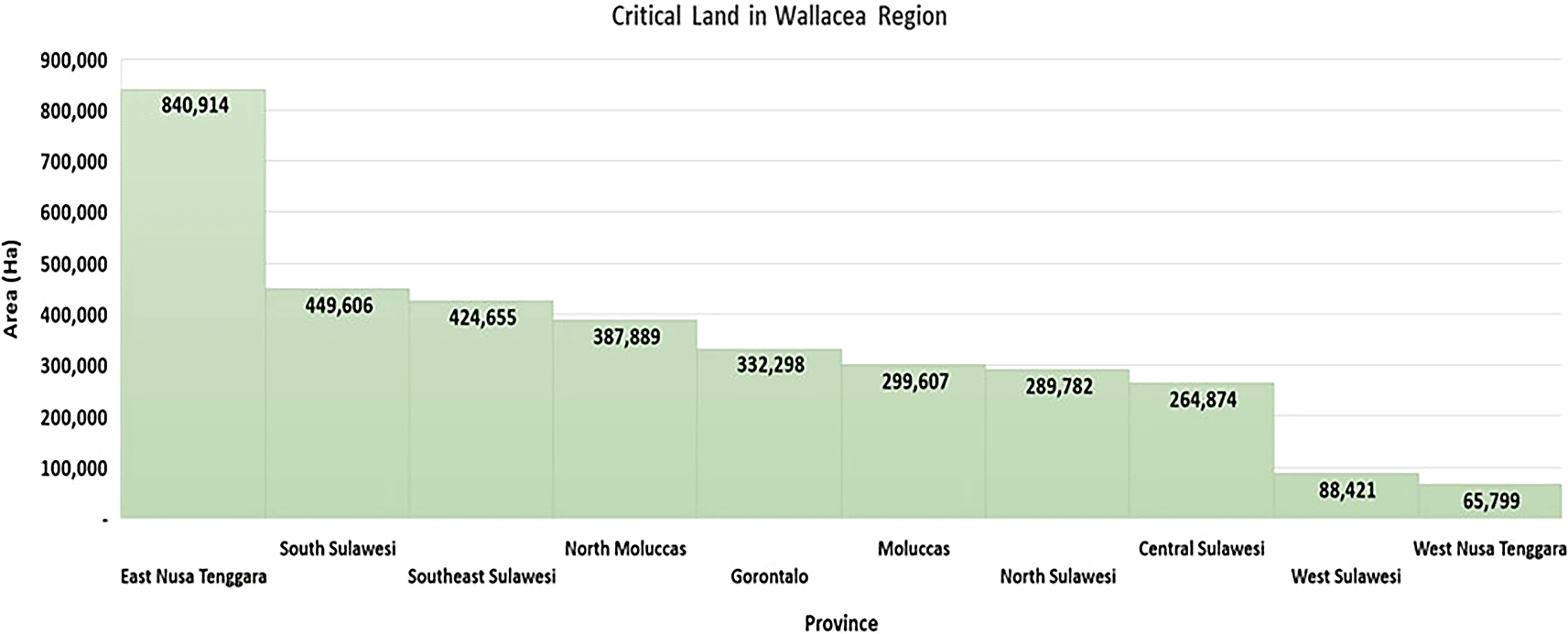 Pressure on forest areas can be seen from information on the area of critical land in the Wallacea region, which has reached 3,443,845 ha, or 24.59% of Indonesia’s critical land area (BPS, 2023) ( Figure 2), including pressure on the mangrove ecosystem areas, which cover an area of 354,059 ha in the Wallacea region (Liyantono et al., 2022). People with livelihoods from the agriculture, forestry, and fisheries sectors spread across 15,874 (89.9%) villages in the Wallacea region face socioeconomic challenges in the use of forest and land resources, including 93.24% of villages being recipients of certificates of incapacity for welfare improvement (BPS, 2023). It is strongly suspected that socioeconomic vulnerability will affect ecological vulnerability through destructive and environmentally unfriendly land resource use activities. Land fires in the Wallacea region experienced a significant increase in the 2016–2019 period. In 2016, land fires reached 36,980 ha/year, and this increased to 280,835 ha/year in 2019 (BPS-Statistics Indonesia, 2023).