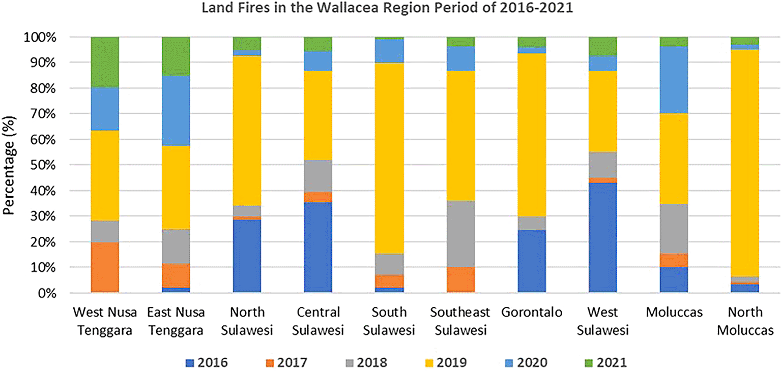 Traditional farming practices commonly use fire to prepare land and manage grassland, especially in semi-arid ecosystems in East Nusa Tenggara (Ngongo et al., 2021, 2022; Tacconi & Ruchiat, 2006). Expansion of agricultural land and deforestation contributed to the increases in fire, land degradation, and air pollution in Sulawesi (Amin et al., 2022; Supriatna et al., 2020). Climate and protracted fires in Wallacea have contributed to the ecosystem dynamics (Hamilton et al., 2019). However, fast changes in land use, particularly for large-scale oil palm expansion, have caused frequent fires on a large scale ( Figure 3) that threaten the region’s biodiversity (Liyantono et al., 2022).
