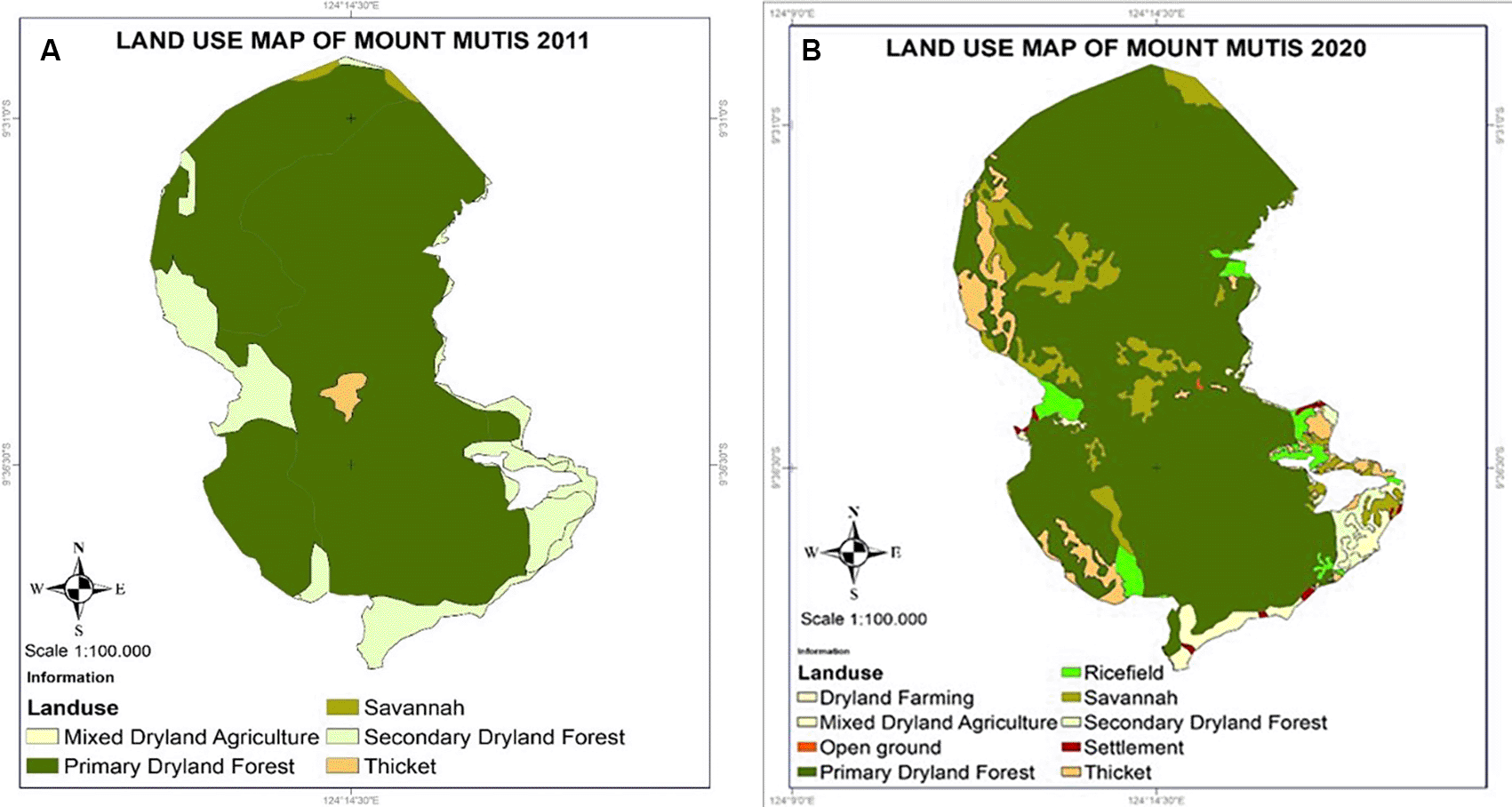The rapid deforestation and land use change in the Wallacea bioregion led to forest areas only being found in conservation areas or in steep locations and areas unsuitable for agriculture, plantation, mining, and other changes. Forest loss occurred not only on the main island of Sulawesi but also on small islands. Several small islands have lost their natural forests and turned into agricultural regions, such as Sangihe, Selayar, and Kalaotoa (Whitten et al., 1987). The following subsections mention the three forest sites representing the main islands with higher rainfall (Sulawesi—tropical rainforest) and lower rainfall (Timor and Sumba islands—dryland/semi-arid forests). However, land cover change mapping has only been analyzed for Mount Mutis and Manupeu Tanadaru Laiwanggi Wanggameti (Matalawa).