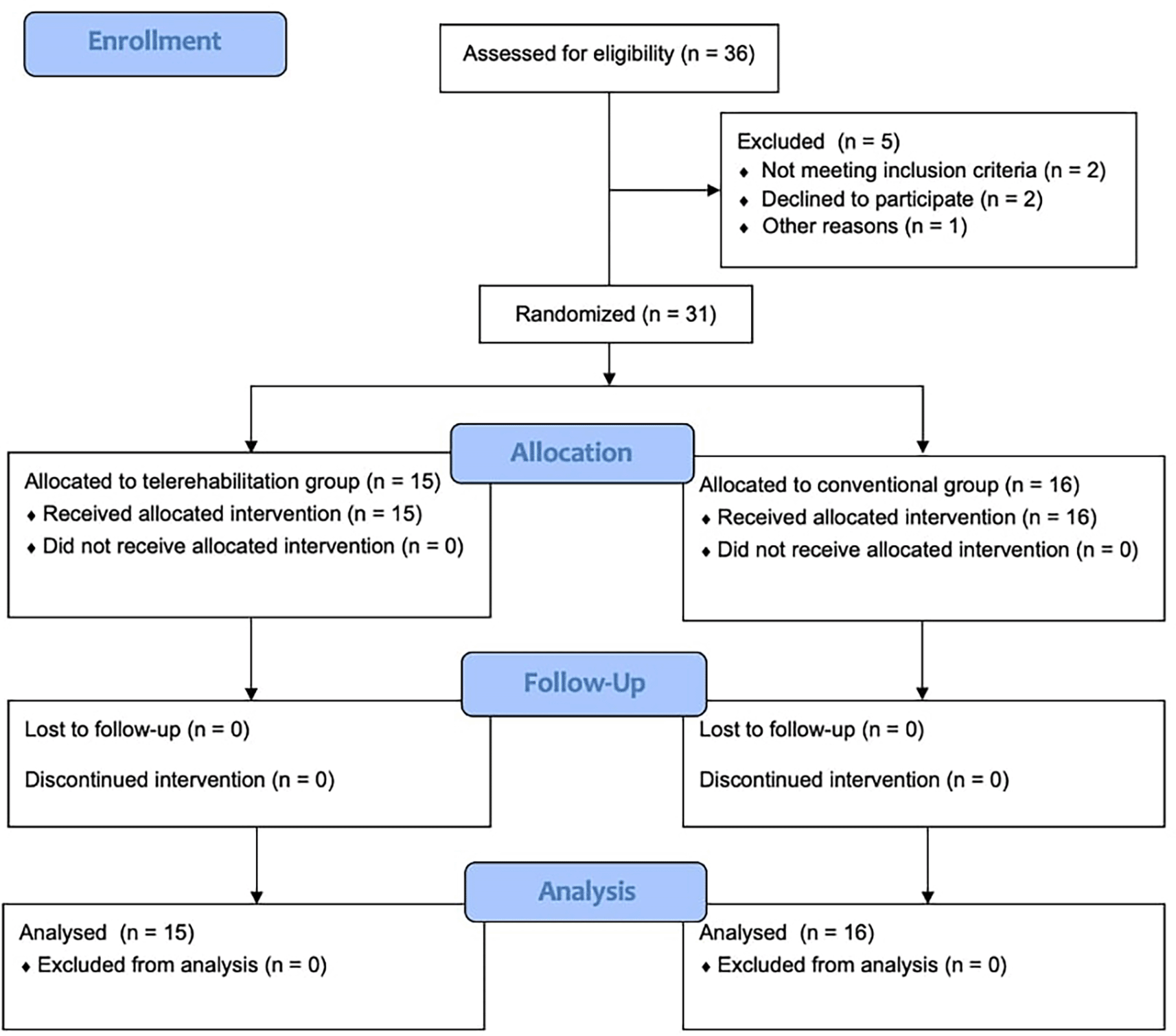 Convenience sampling was selected for this study. Considering that this was a pilot study, 30 participants were anticipated (15 for each group). The final study sample included 31 participants (15 in the TR and 16 in the CG), as shown in Figure 1. Recruited participants were included in this study based on the following criteria: (1) residents of the UAE, only females; (2) aged between 18 and 45 years; (3) had normal BMI: 18.5 – 24.9 kg/m216; (4) referred to physiotherapy by an orthopedic surgeon for chronic non-specific neck pain; (5) a minimum pain score of 3 cm on the VAS Pain (Visual Analog Scale for Pain); (6) pain onset at least 3 months ago; and (7) provided informed verbal and written consent for voluntary participation. The exclusion criteria were as follows: (1) diagnosis by an orthopedic surgeon with any pathological condition as the cause of chronic neck pain; (2) presently undergoing any physical treatment or taking any medication for said pain; (3) comorbidities such as diabetes and hypertension; (4) conditions such as migraine and cervicogenic headache; (5) vertigo and/or vertebrobasilar insufficiency; (6) physically disabled or recently immobilizing injury; (7) orthopaedic conditions, such as spondylosis, spondylolisthesis, wryneck; (8) current pregnancy; and (9) history of neurological conditions.