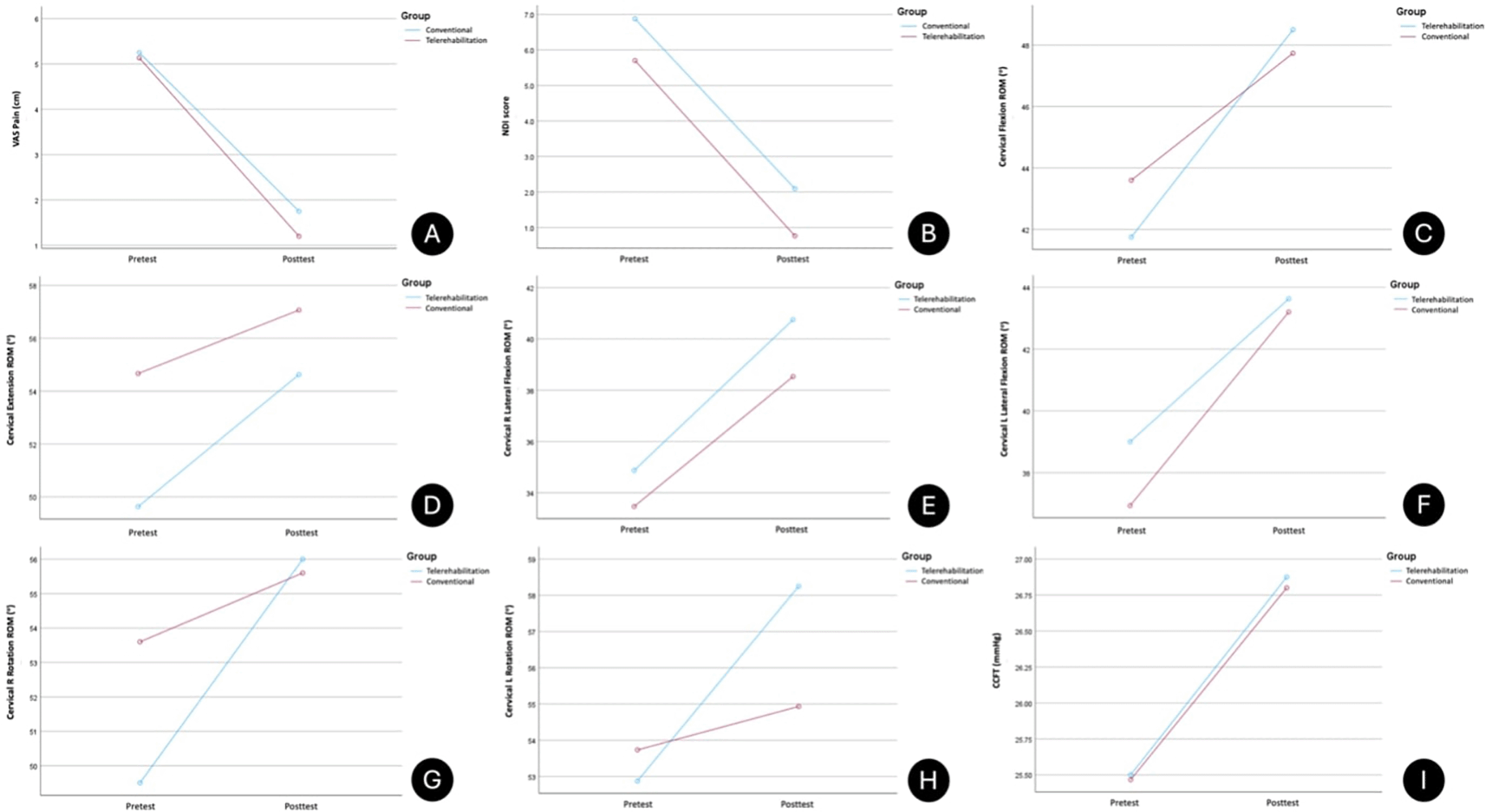 Based on mixed model ANOVA measures (0 week and 6 weeks), within-group comparisons for both groups showed statistical significance in favour of the exercise programme, for all variables (p<0.05). Telerehabilitation group showed significantly more increase in cervical rotation ROM R (0.006) and L (0.03) post-exercise programme, and longer duration of treatment session (0.02) as compared to conventional group. Between-group comparisons showed no significant differences for all other variables.
