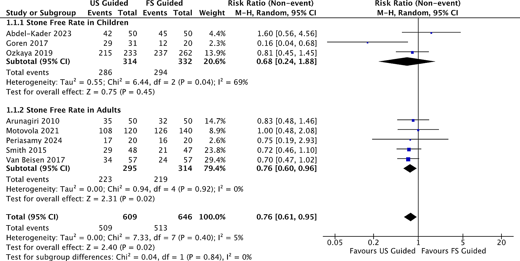 The study’s primary outcome was stone-free rate, while the secondary outcome was a complication rate. We also performed subgroup analysis dividing the outcomes in two subgroups, which are adults and children subgroups.