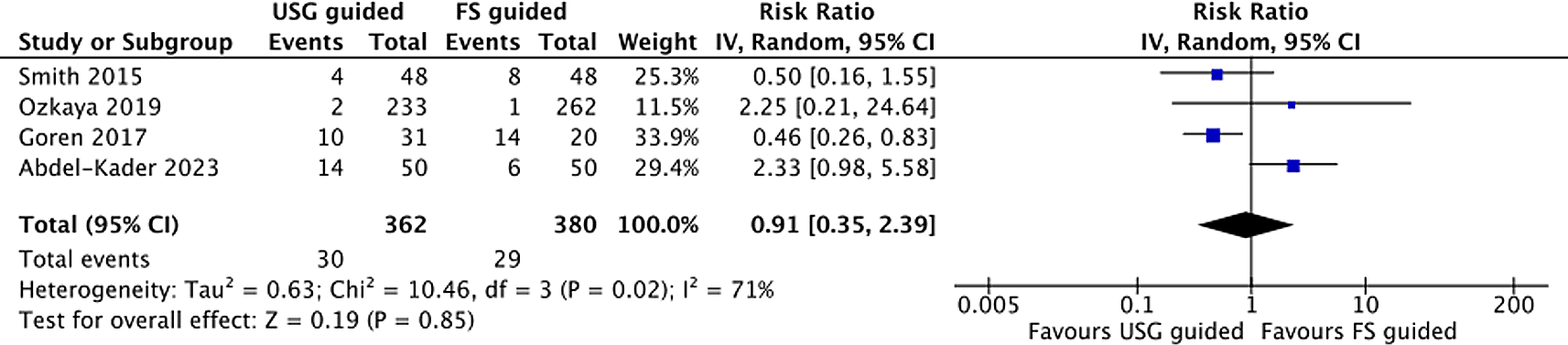 | Periasamy, 202412 | Retrospective Study | Adults age 20-60 years old were retrospectively reviwed | Group US: 20 patients Group FS: 20 patients | Group US: 17/20 (85%) Group FS: 16/20 (80%) |