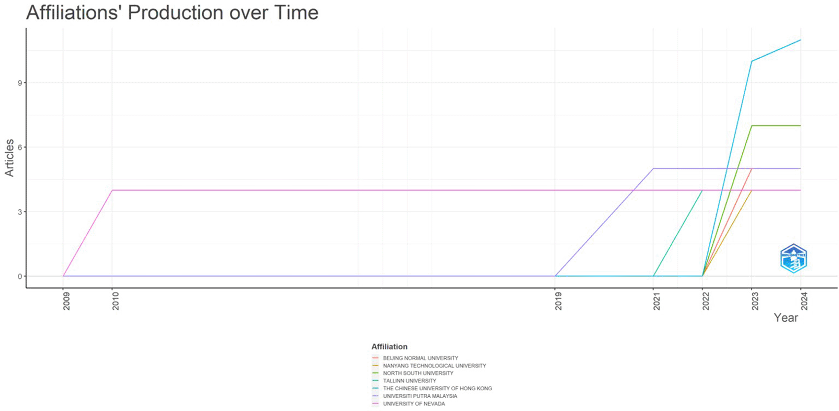 With publications in this area starting in 2022 and rising yearly after 2023, the Chinese University of Hong Kong and North South University have shown steady and significant development in their outputs. Since 2003, however, the other universities have contributed very little to this field of study.