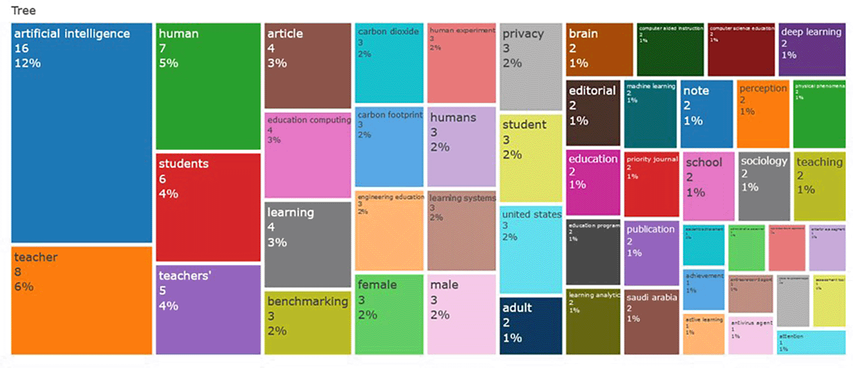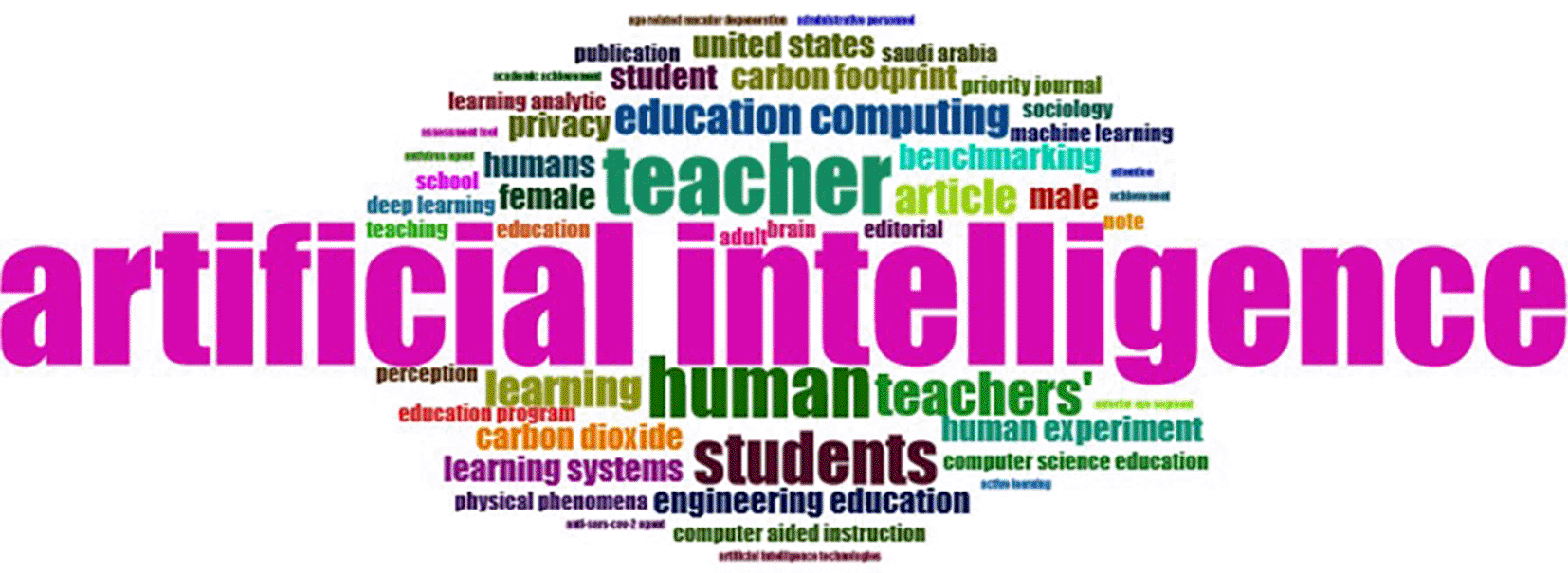 A quantitative analysis of the influence of scholarly literature is shown in Figure 7, possibly using bibliometric techniques. This assessment takes into account measures like publications and citations, offering a quantifiable indication of the impact and prominence of research results. Important terms like “Artificial Intelligence,” “Teacher,” “Teachers,” “Students,” and “human,” which probably reflect major issues in the literature, are included in the study. According to the results, “Artificial Intelligence” became the most popular topic, especially in 2023, indicating a major emphasis on AI and its cooperation with educators.