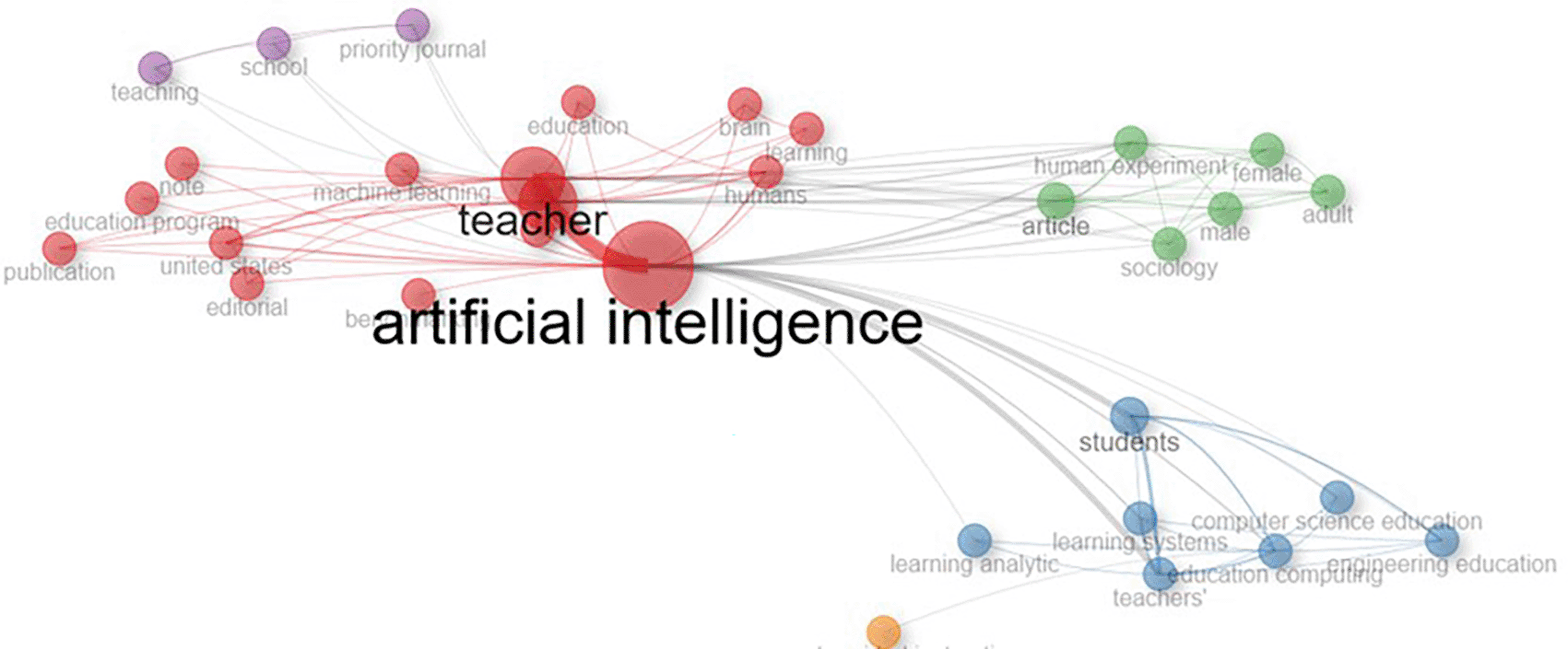 Different theme streams in the literature on AI-teacher collaboration in education are revealed by the co-occurrence network analysis. Colour-coded clusters are used to graphically represent these streams. Because of its high centrality, the red cluster is considered the central cluster, indicating that certain keywords within it are more important to the network as a whole. Other subjects in the literature are probably influenced and connected by these important terms, which serve as connectors.