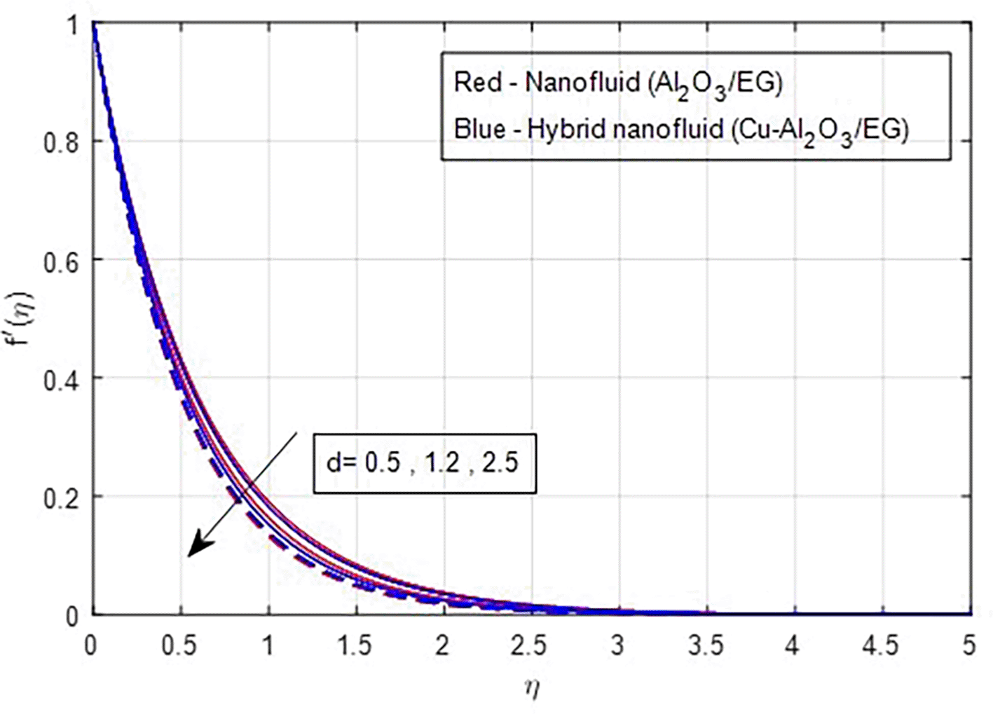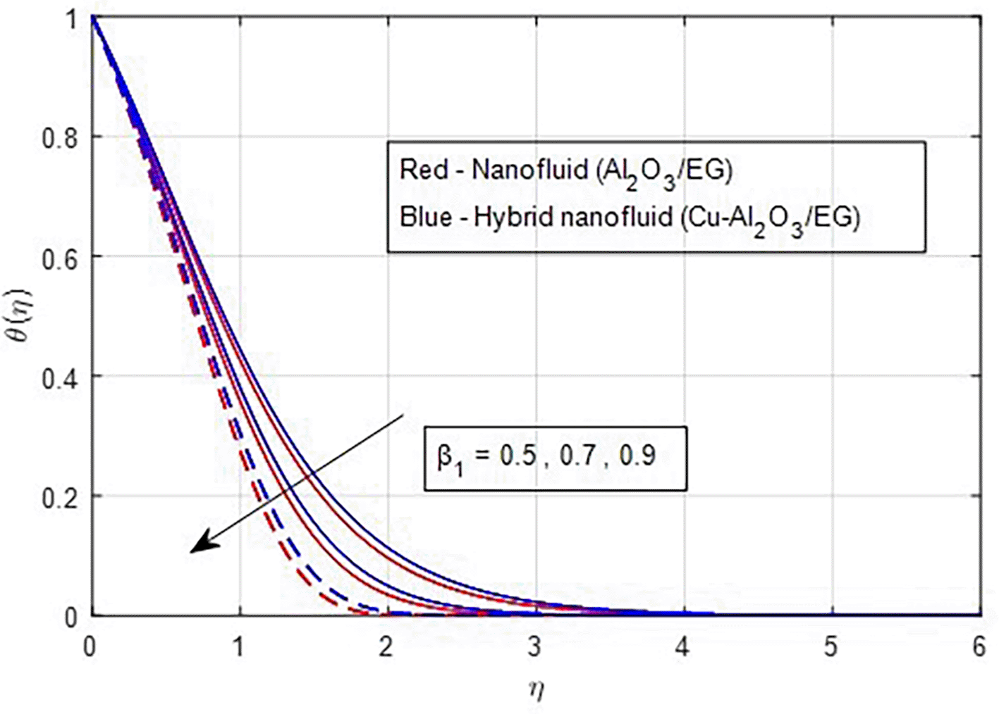 • Temperature curves diminishes with increases estimates of nanofluid volume fraction and hybrid nanofluid volume fraction. When nanoparticles are added to a base fluid, the viscosity increases and the fluid temperature falls. When viscosity increases, temperature decreases.