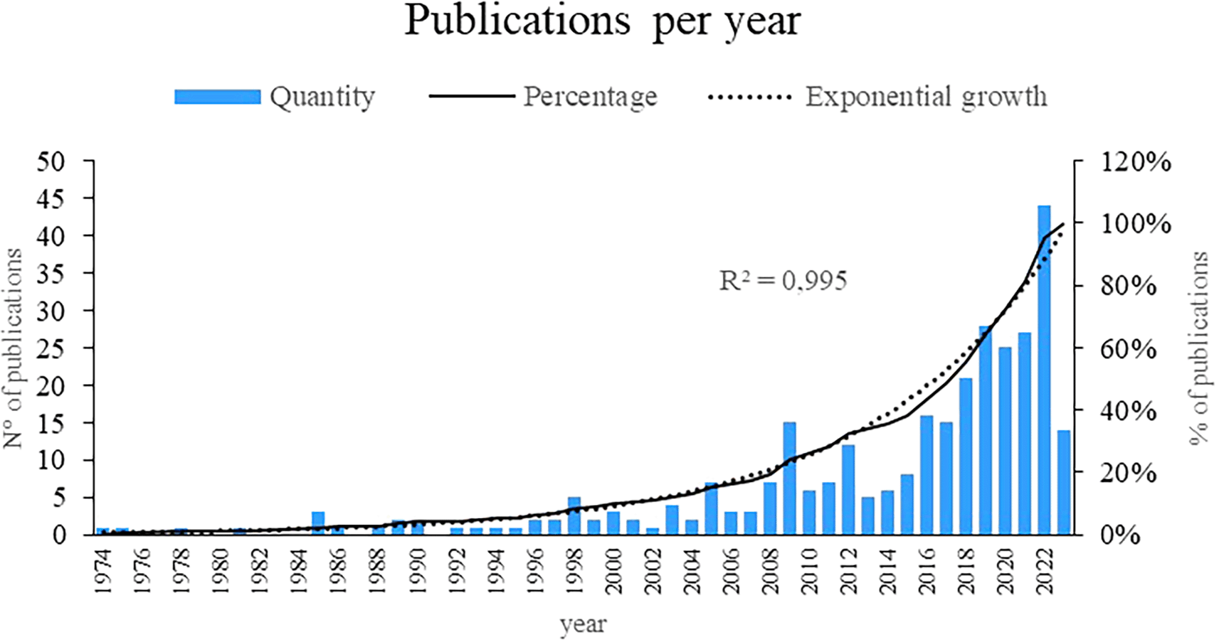 The period between 1974 and 2000 has seen a remarkable emergence and development of research in women’s studies in Latin America. During these decades, different cultures and research systems have played a crucial role in shaping the direction and focus of these studies. Initially, an incipient attention can be observed in 1974, which over time is transformed into an exponential growth of 99.5% in the annual production of scholarly articles on the subject. It is particularly relevant to highlight the years 2019, 2020, 2021, and 2022 as the culminating moments with the highest production, highlighting a constantly growing interest and recognition. This increase reflects not only the greater attention given to gender studies, but also the diversification of the topics addressed.